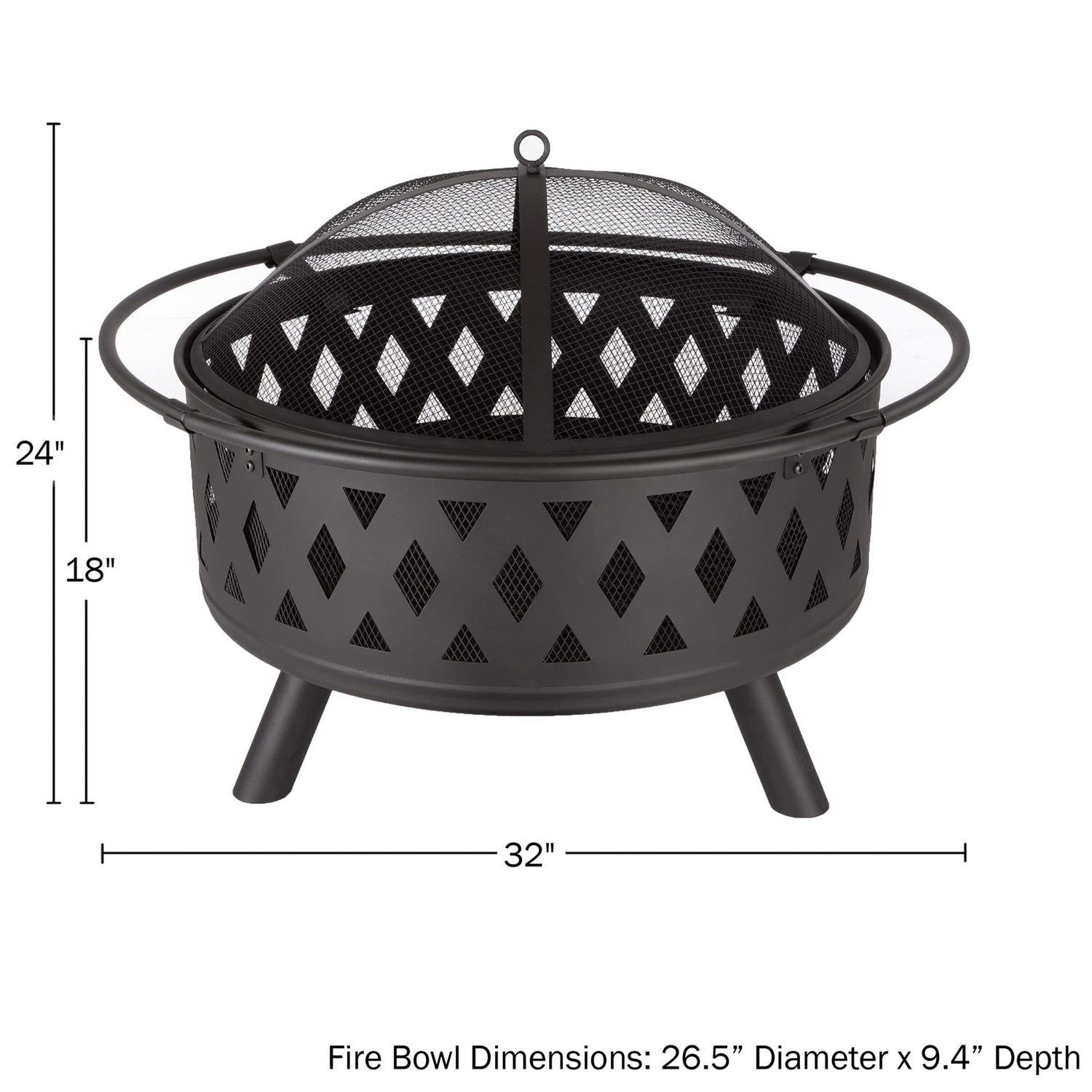 - PRODUCT DETAILS - Materials: Powder-Coated Steel and PVC. Dimensions: (L) 32” x (W) 32” x (H) 18”; Safety Screen: (H) 6”; Fire Bowl: (L) 26.5” x (H) 9.4”. Weight 22lbs. Some Assembly Required. Color: Black.