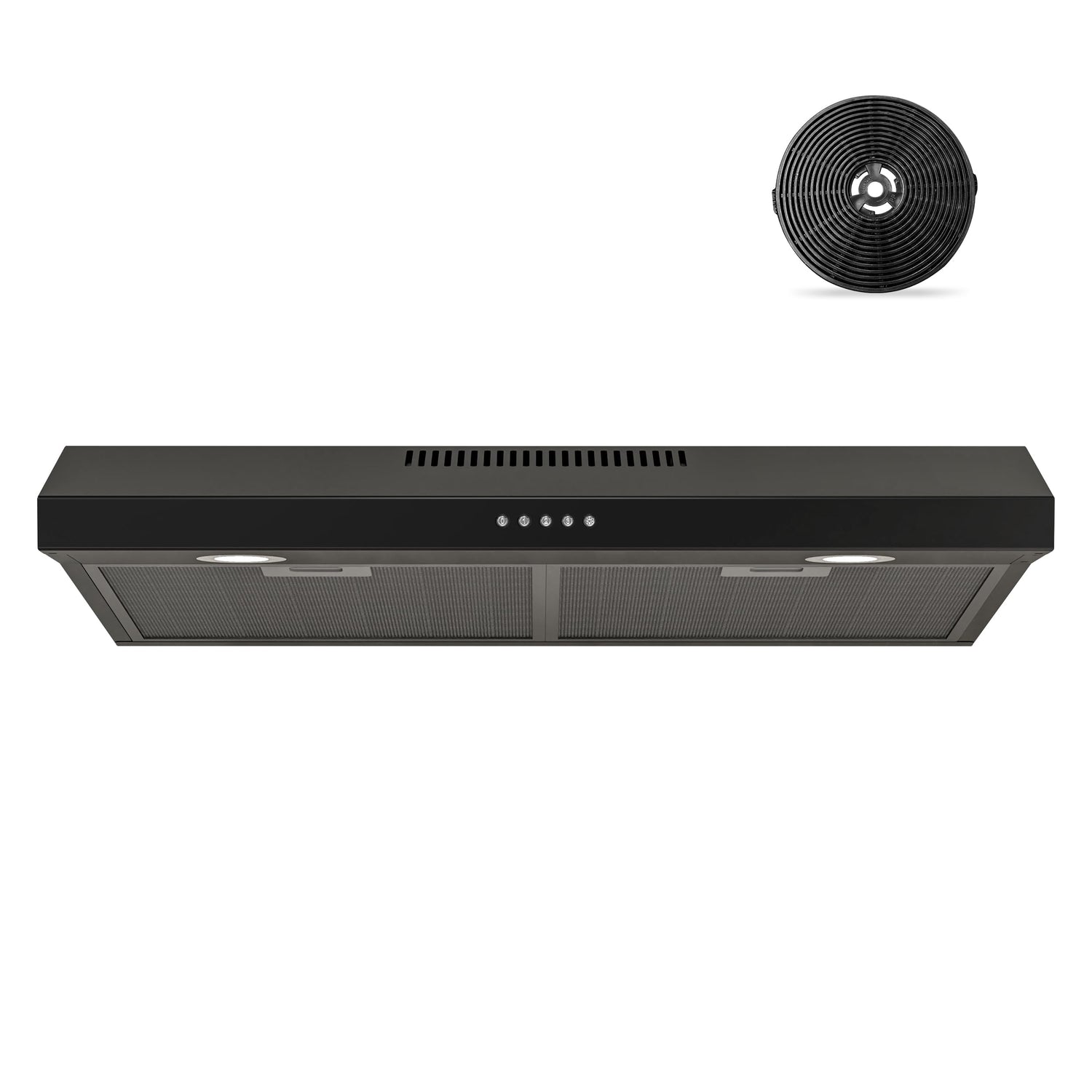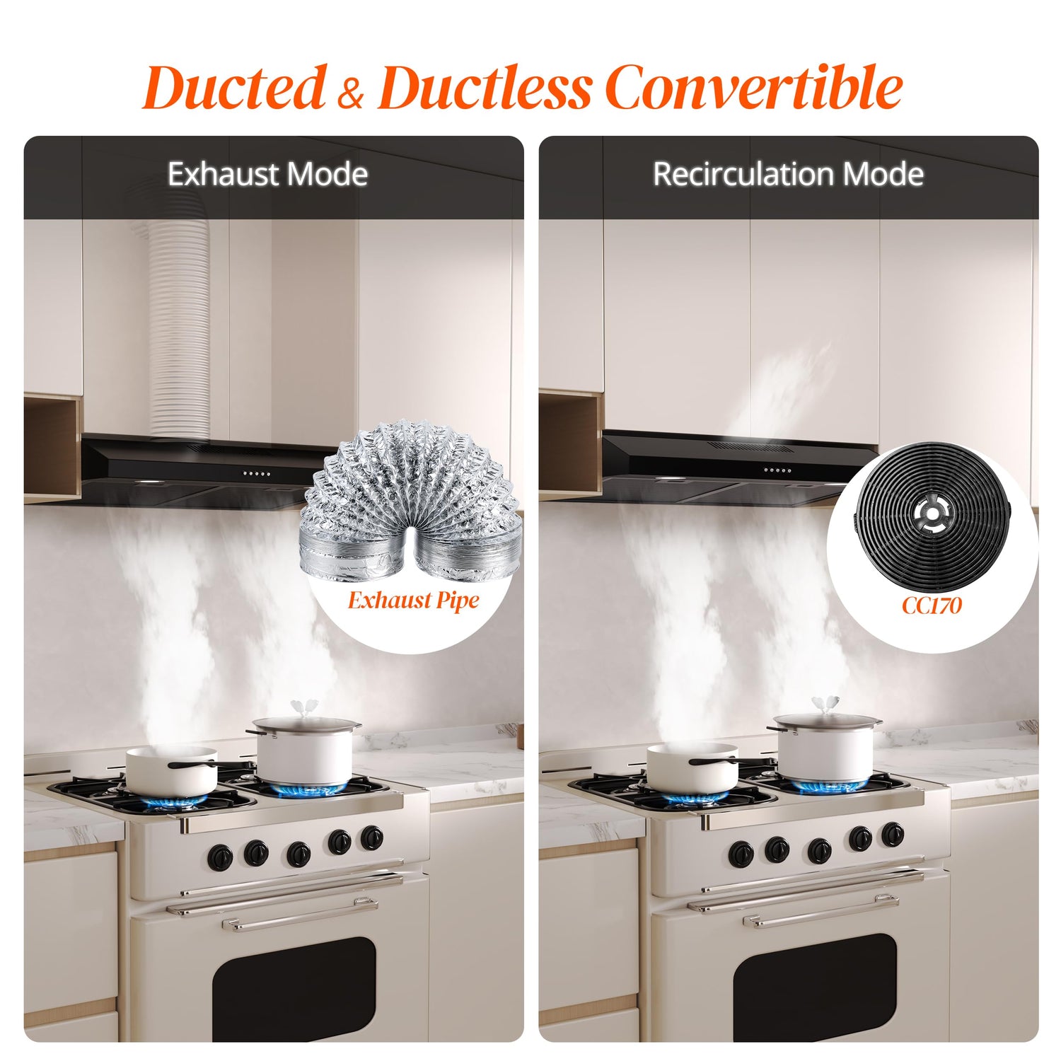 - Efficient Filtration: Designed with 3-layer aluminum filters, this under cabinet range hood 30 inch effectively captures grease and contaminants from the air. The filters are easy to clean and maintain. The vent hood can ducted and ductless convertible, equipped with CC170 carbon filter.