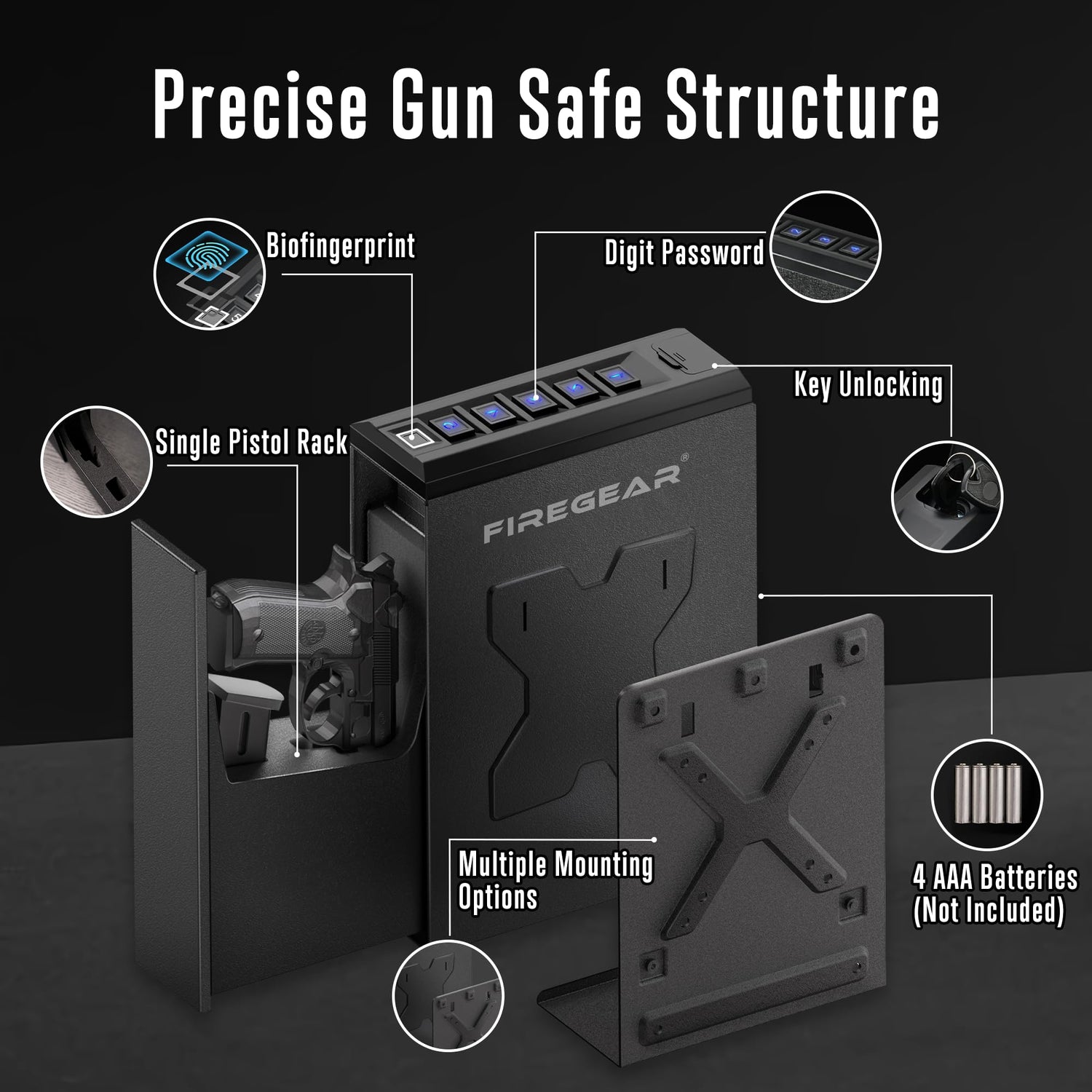 FIREGEAR Gun Safe Biometric Pistol Safe, Quick Access Handgun Safe, Safes for Handgun with Fingerprint, PIN Code, KEY, Mounted Nightstand and Gun Lock