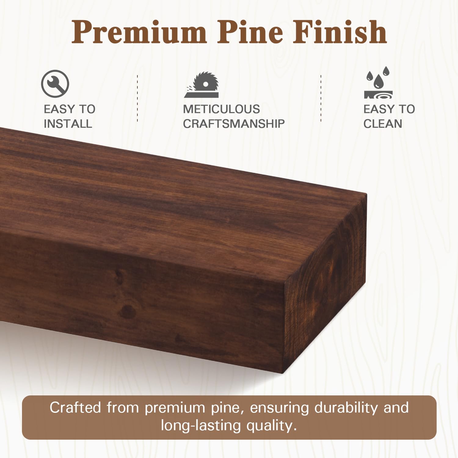 - Solid Strength & Design: Crafted from solid pine, the natural grain of this handcrafted floating mantel shelf adds classic charm to your home. Sealed with a water-resistant finish, it combines rustic beauty with durability.