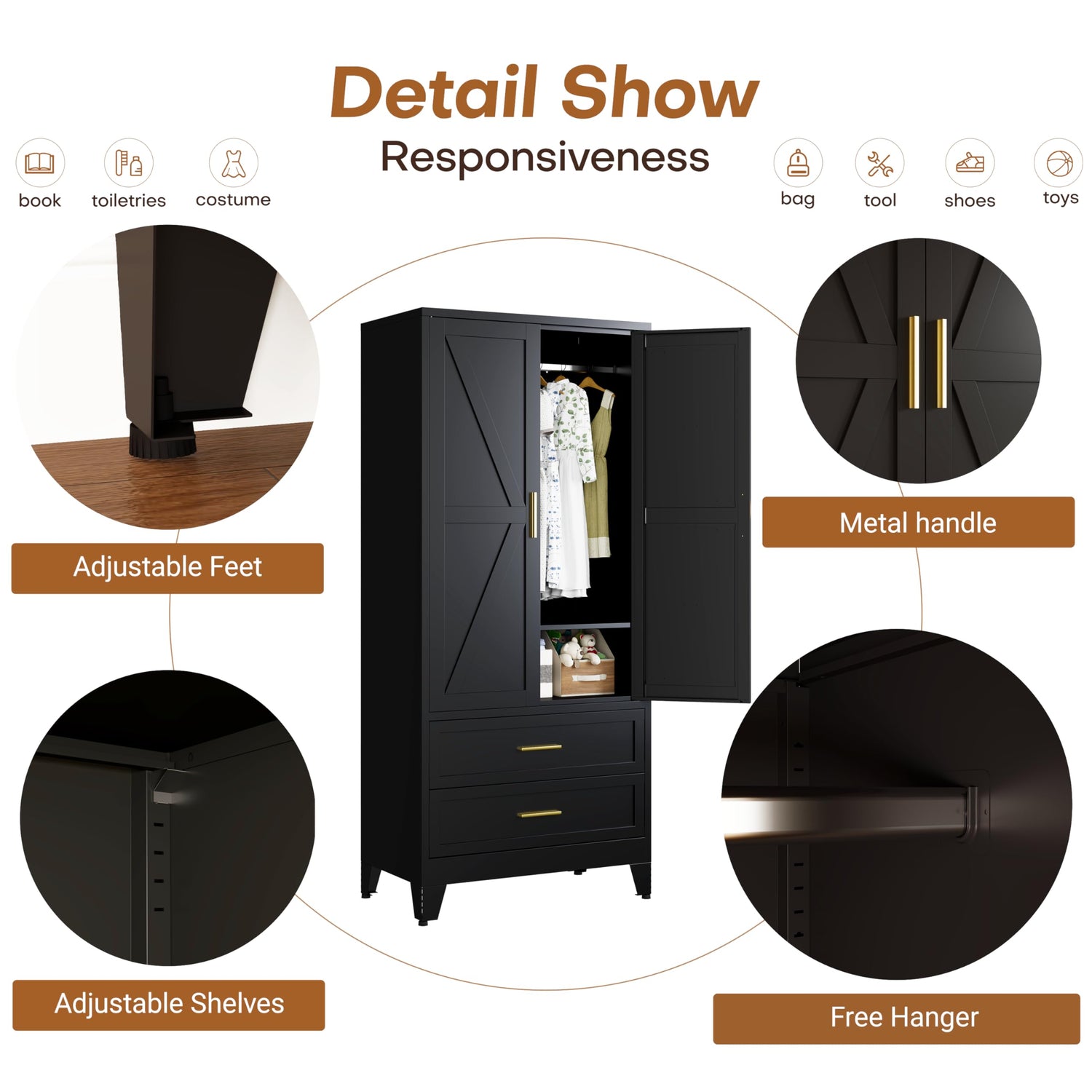 - 【Secure and Stable Design】: Each door of the metal wardrobe closet has 2 strong magnets to ensure a tight closure. 4 adjustable height balancing feet can keep the cabinet stable even on uneven ground. The wardrobe also features an anti-tilt design with pre-drilled holes on the back, allowing for secure wall mounting to prevent accidental tipping , protecting your and your family's safety.