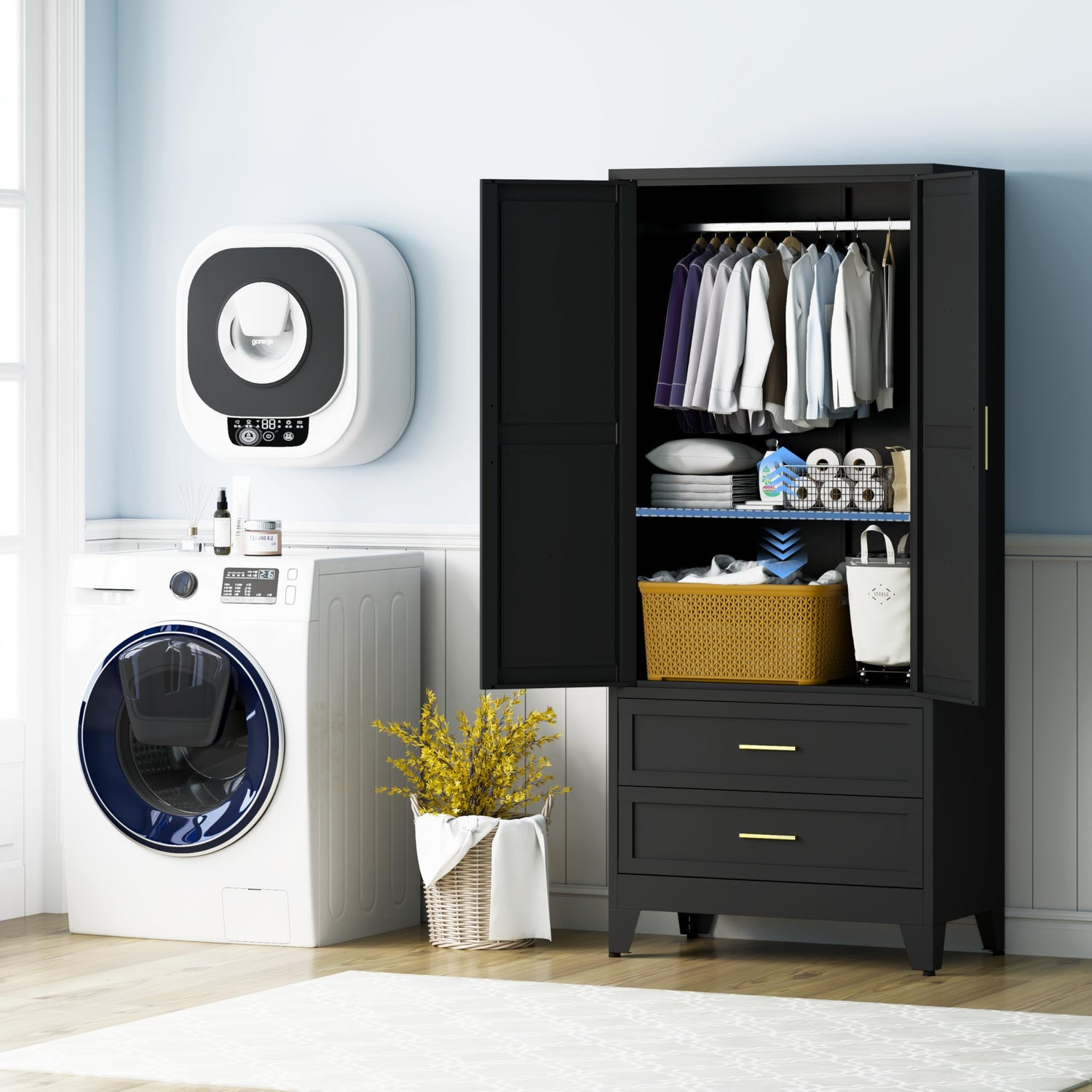 FIRMET Metal Wardrobe Closet Cabinet with Drawers,71" H Large Bedroom Armoires with Shelves and Hanging Rod,Wardrobe Storage Cabinet with 2 Doors, 1 Adjustable Shelf and 2 Drawers
