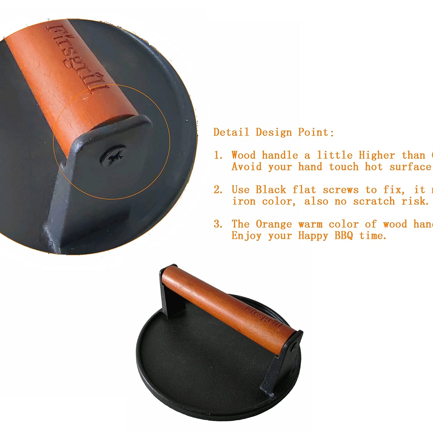 Firsgrill Burger Press 7.08" Round,Heavy-Duty Cast Iron Smash Burger Press Meat Steak With Wood Handle for Blackstone Camp chef Pitboss Weber Griddle Grills(Round)