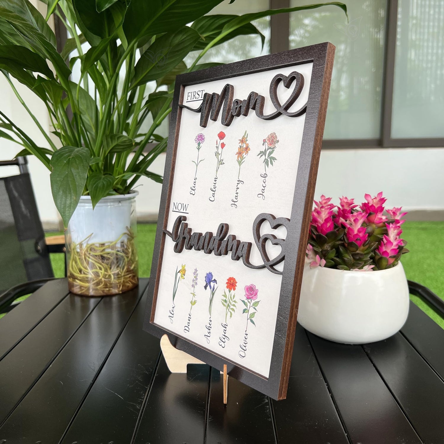 - 💐 Personalized mothers day gifts for mom - Also Personalized Mothers Day Gifts for Grandma: Create your own mothers garden sign wooden plaque by clicking "Customize Now" and adding names. The product includes one custom wooden plaque, feature personalized birth flowers for each family member's name, and one wooden display stand. Our custom wooden plaques perfect for mothers day gifts from kids, daughter, son, husband, mothers day gifts for wife, mom, friends, grandma, nana, gigi, mimi.
