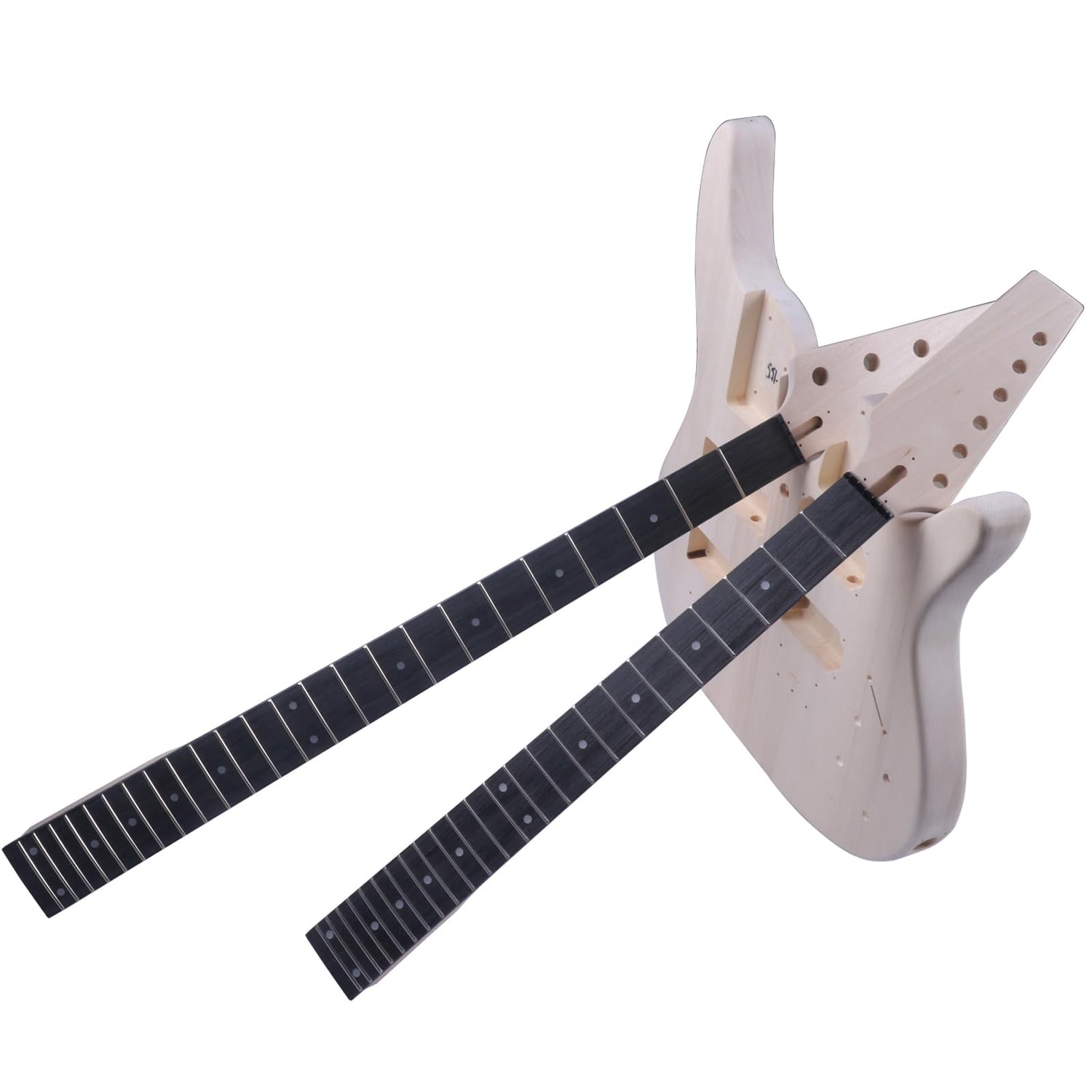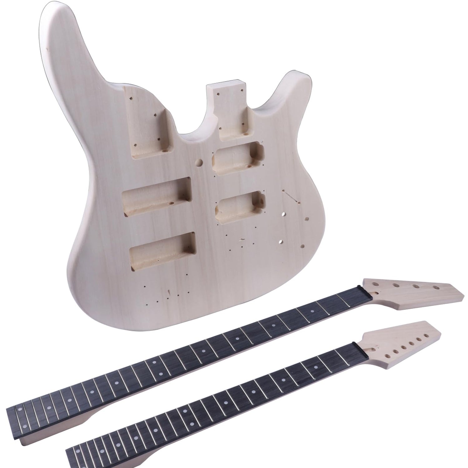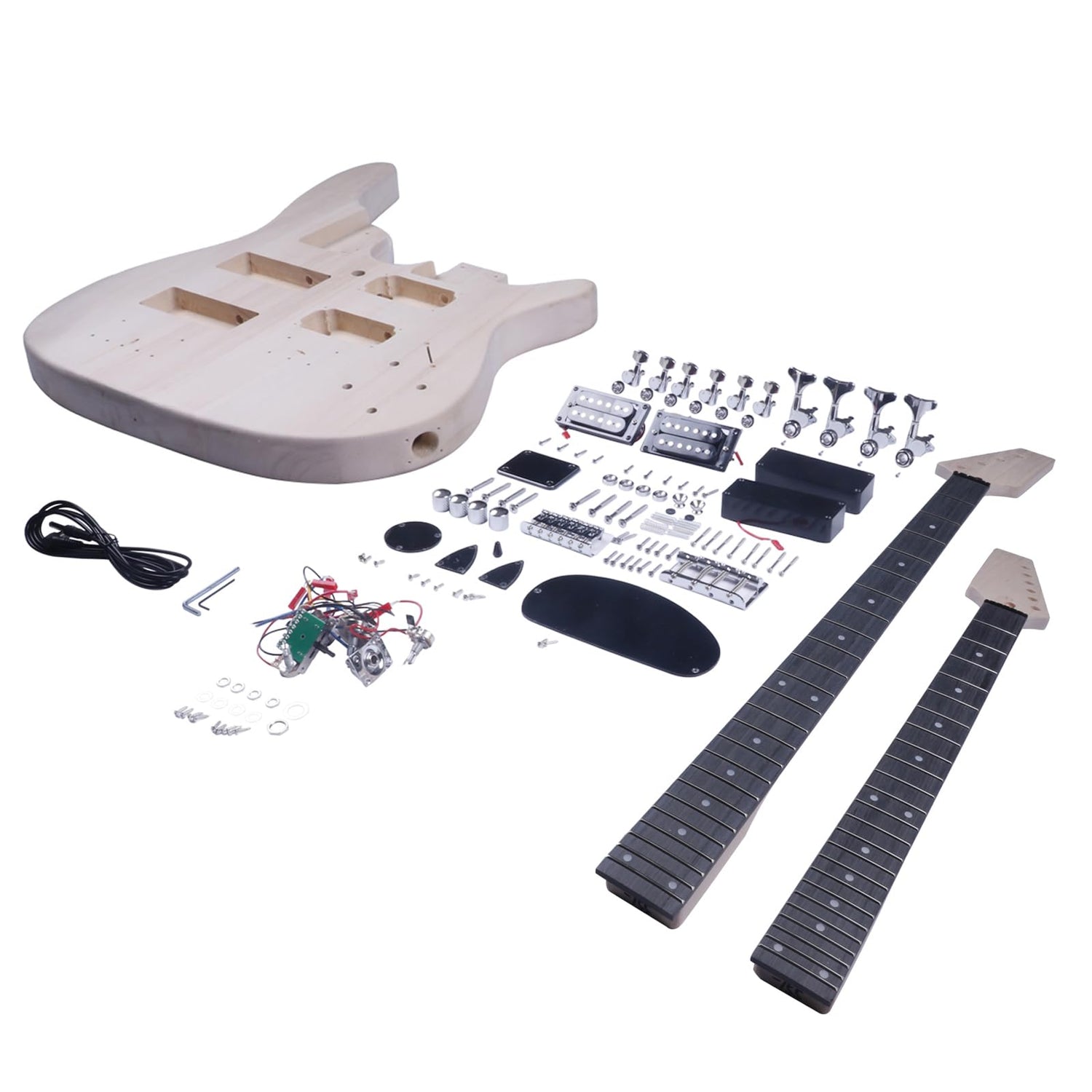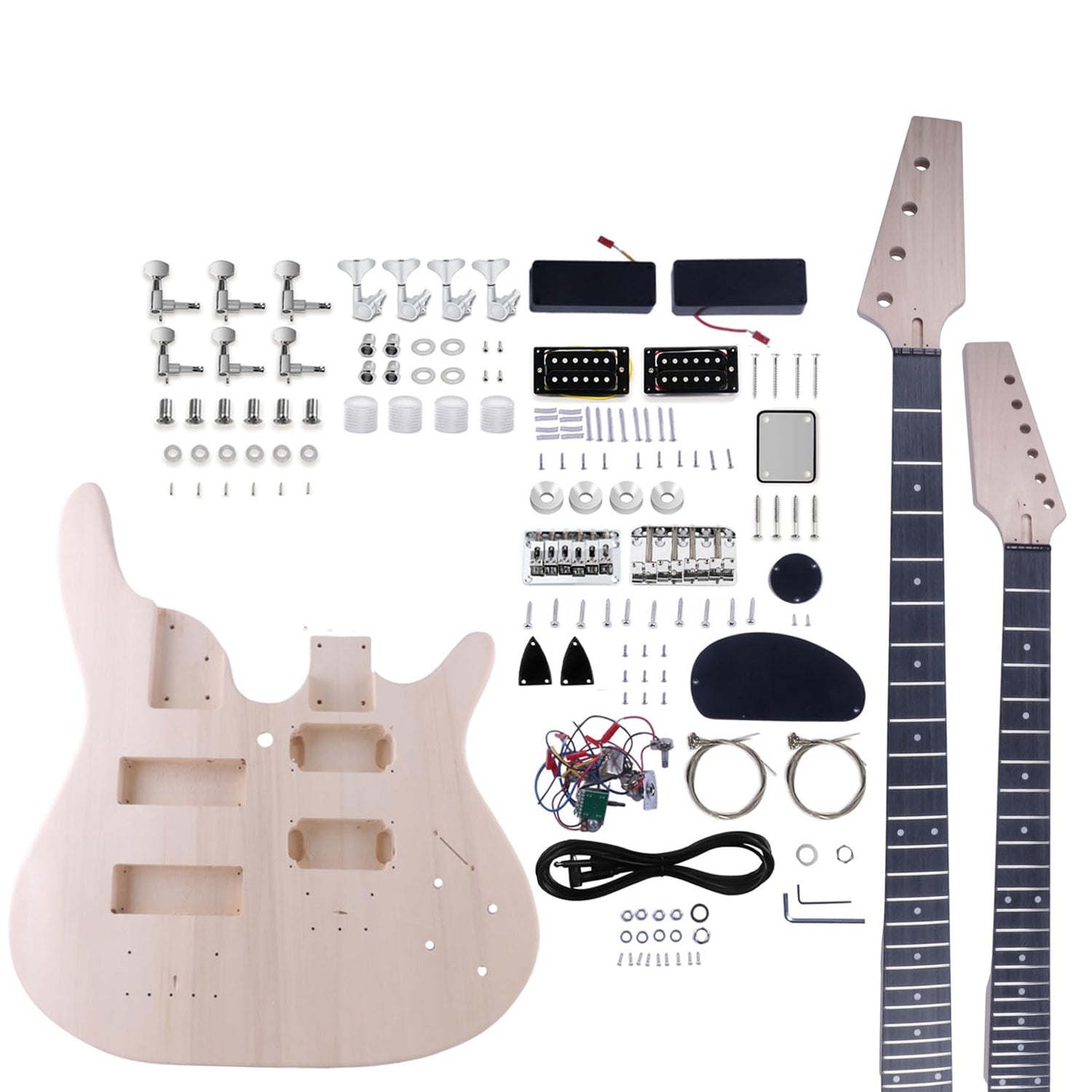 • EVERYTHING YOU NEED IN ONE BOX: This great value DIY double neck guitar and bass kit has all the necessary parts and hardware for a professional level build. Without any of the hassle and expense of sourcing all of the parts, everything you need is in one box!