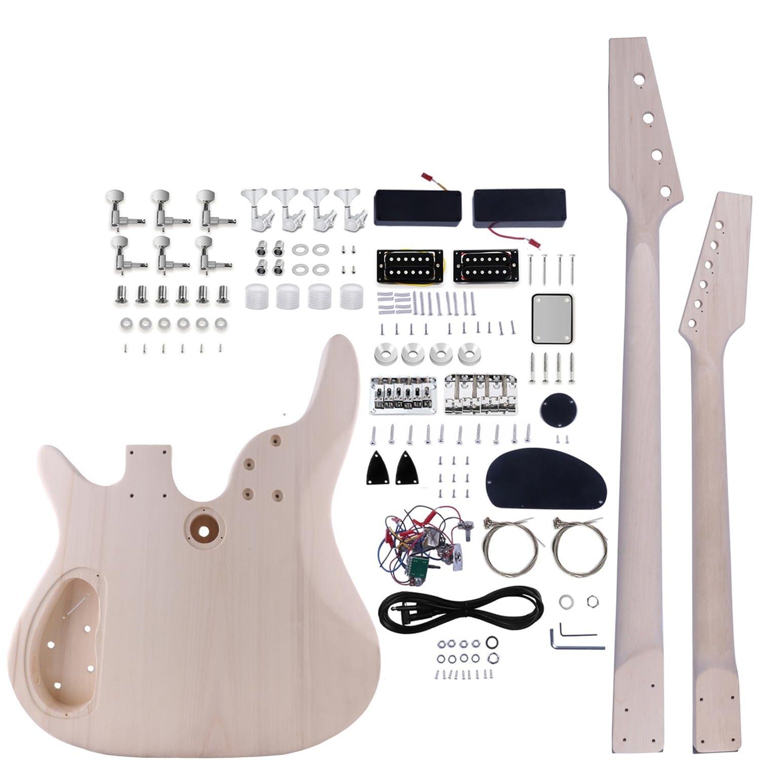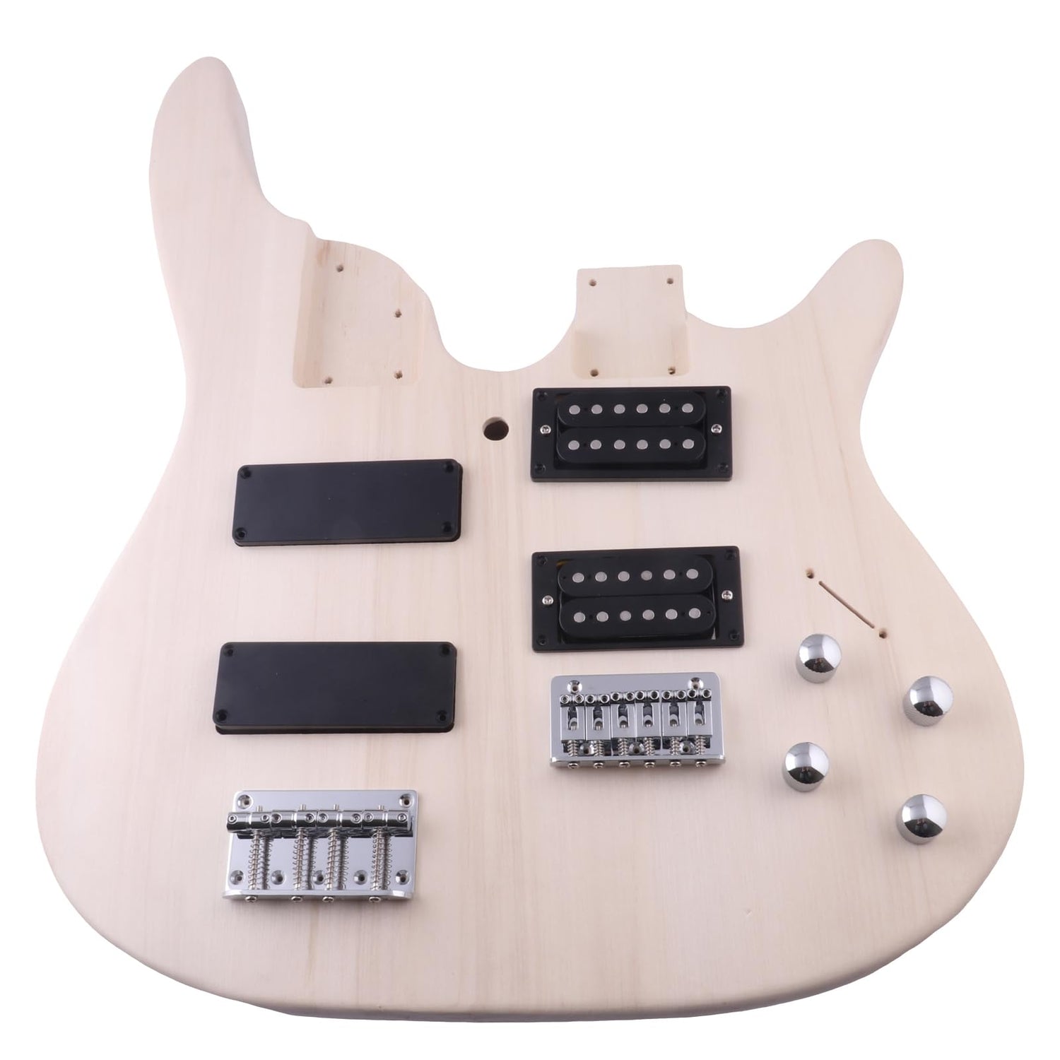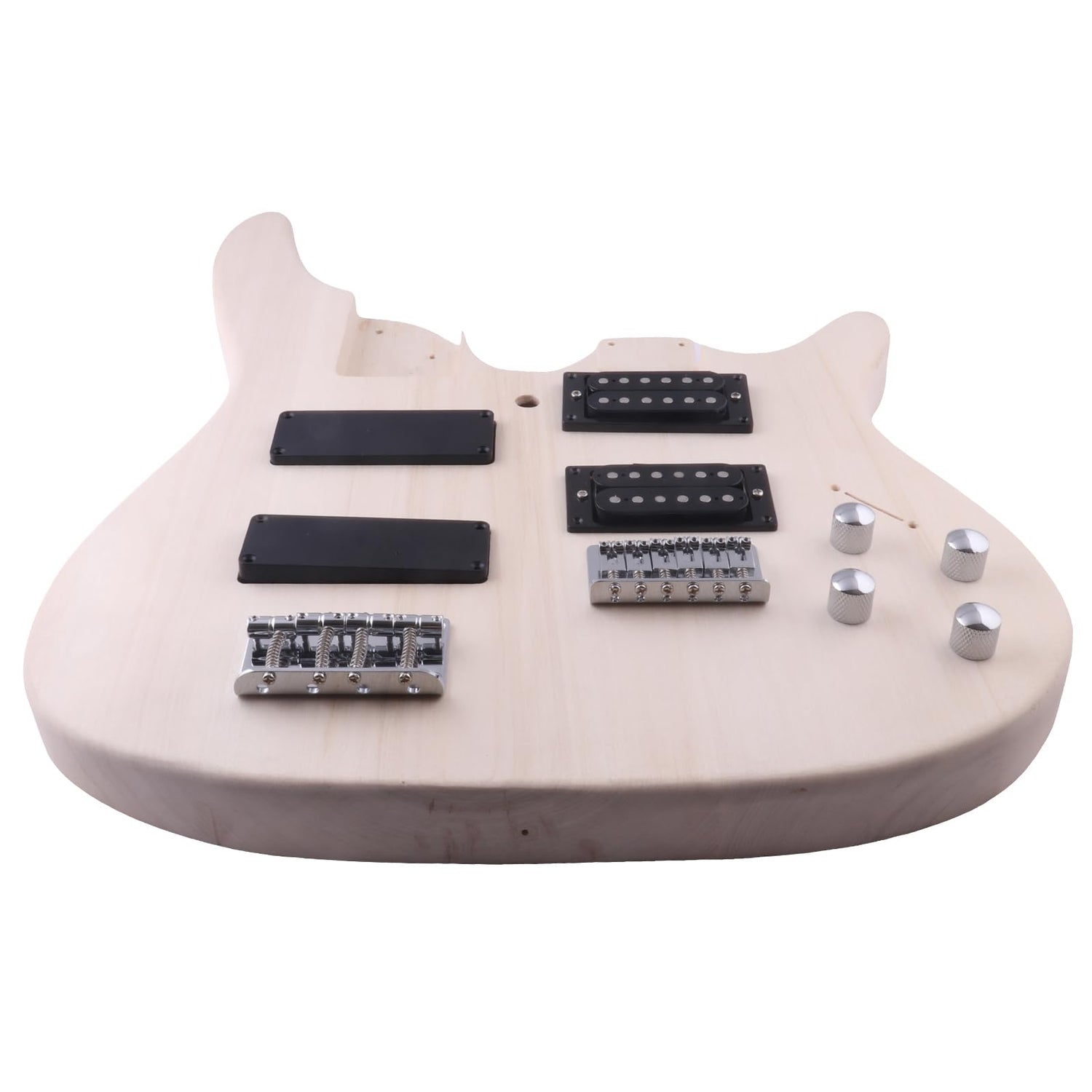 • HIGH-QUALITY COMPONENTS: This build your own guitar and bass kit includes basswood body, 6 String and 4 String Twin hard maple neck with poplar laminated fingerboard, humbucker pickups, 3 way toggle, 3 way selector and die-cast chrome machine heads.