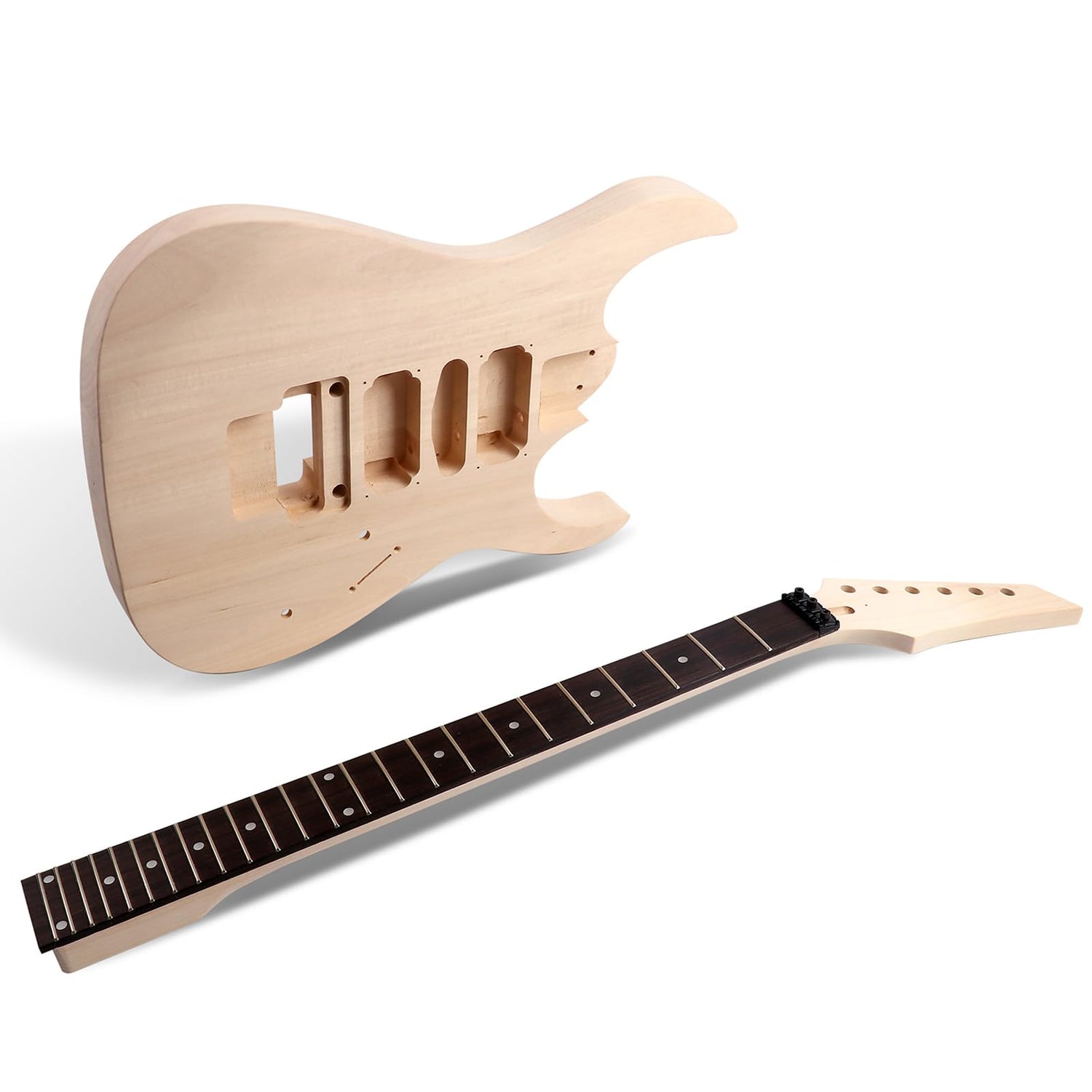 - CUSTOMISE TO YOUR OWN STYLE: The body comes cut and sanded, but completely unfinished, so you can paint, stain, varnish or finish your guitar to any design you wish. The hard maple neck also comes with an unfinished headstock, so you can mark up it, be it something completely original, or a tribute to an iconic instrument.