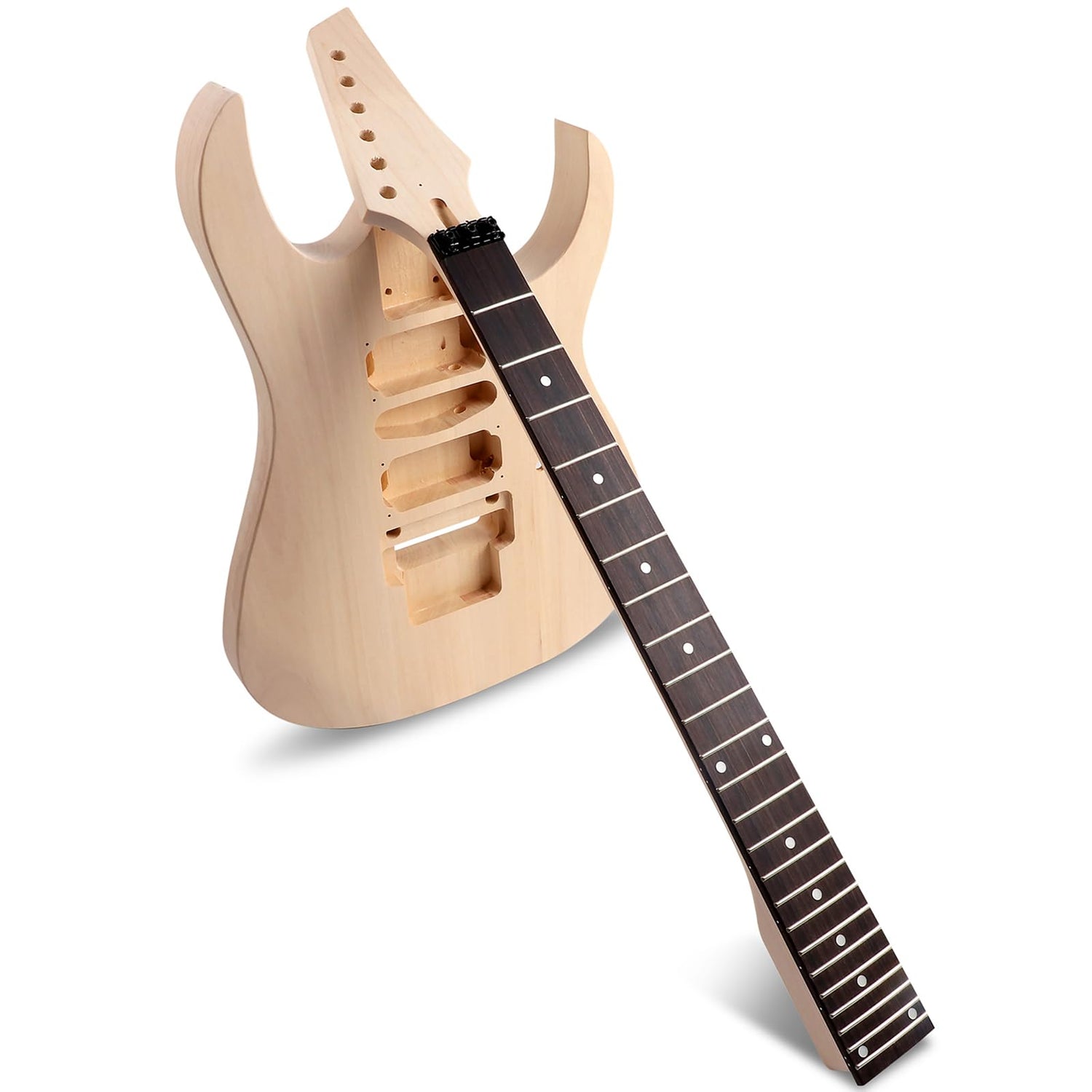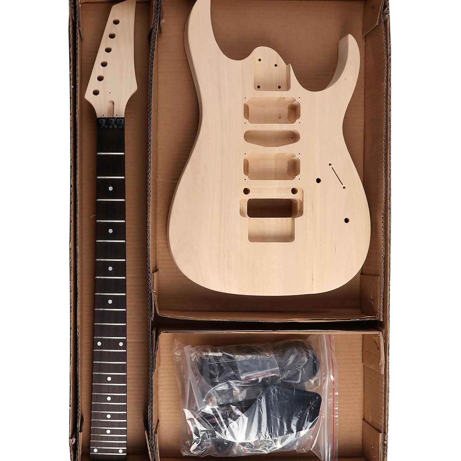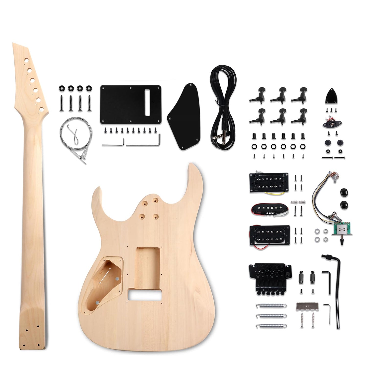 The DIY electric guitar kit provides you with all the necessary components for a beginner level build. Ever wanted to build your own guitar? Now you can with this practical DIY guitar kit. With all of the hardware and components provided, along with an unfinished body made of high grade basswood and hard maple neck with a poplar laminated fretboard, you have everything you need to make a unique style guitar.