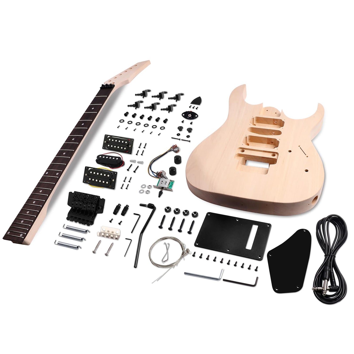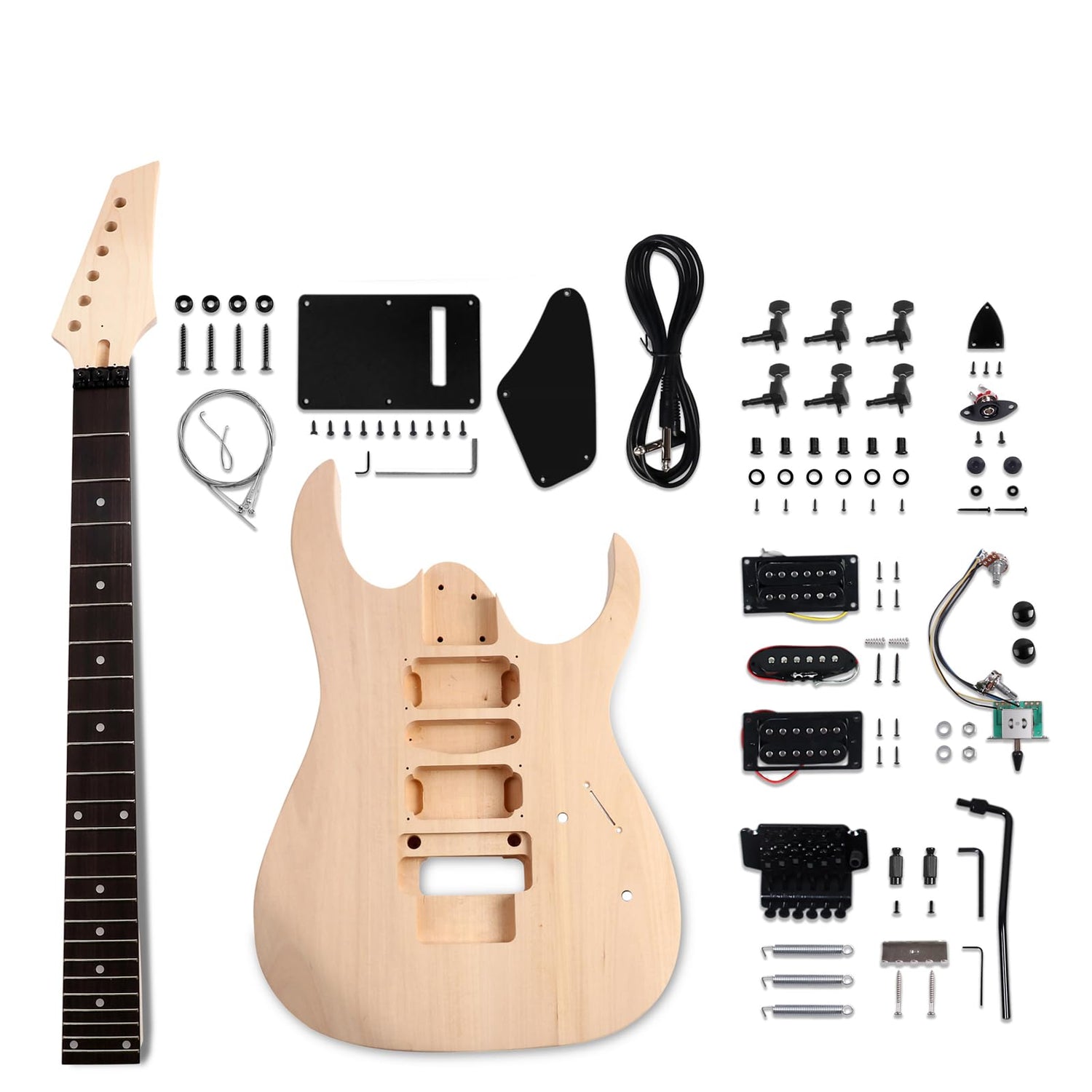 - HIGH-QUALITY COMPONENTS: This Build Your Own Electric Guitar Kit includes a basswood body; The inclusion of a high quality wooden body ensures you can create a playable instrument that sounds great. Also provided with the kit is a hard maple neck, with poplar laminated fingerboard, for a smooth playing experience that is easy to learn and gig on.