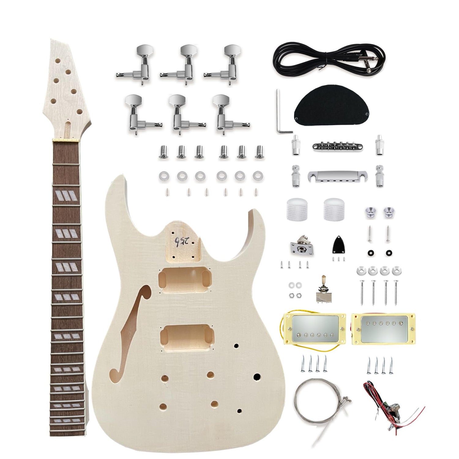 - HIGH-QUALITY COMPONENTS - This Build Your Own Electric Guitar Kit includes a basswood body with flamed maple veneer top; The inclusion of a high quality wooden body ensures you can create a playable instrument that sounds great. Also provided with the kit is a hard maple neck, with rosewood fingerboard, for a smooth playing experience that is easy to learn and gig on.