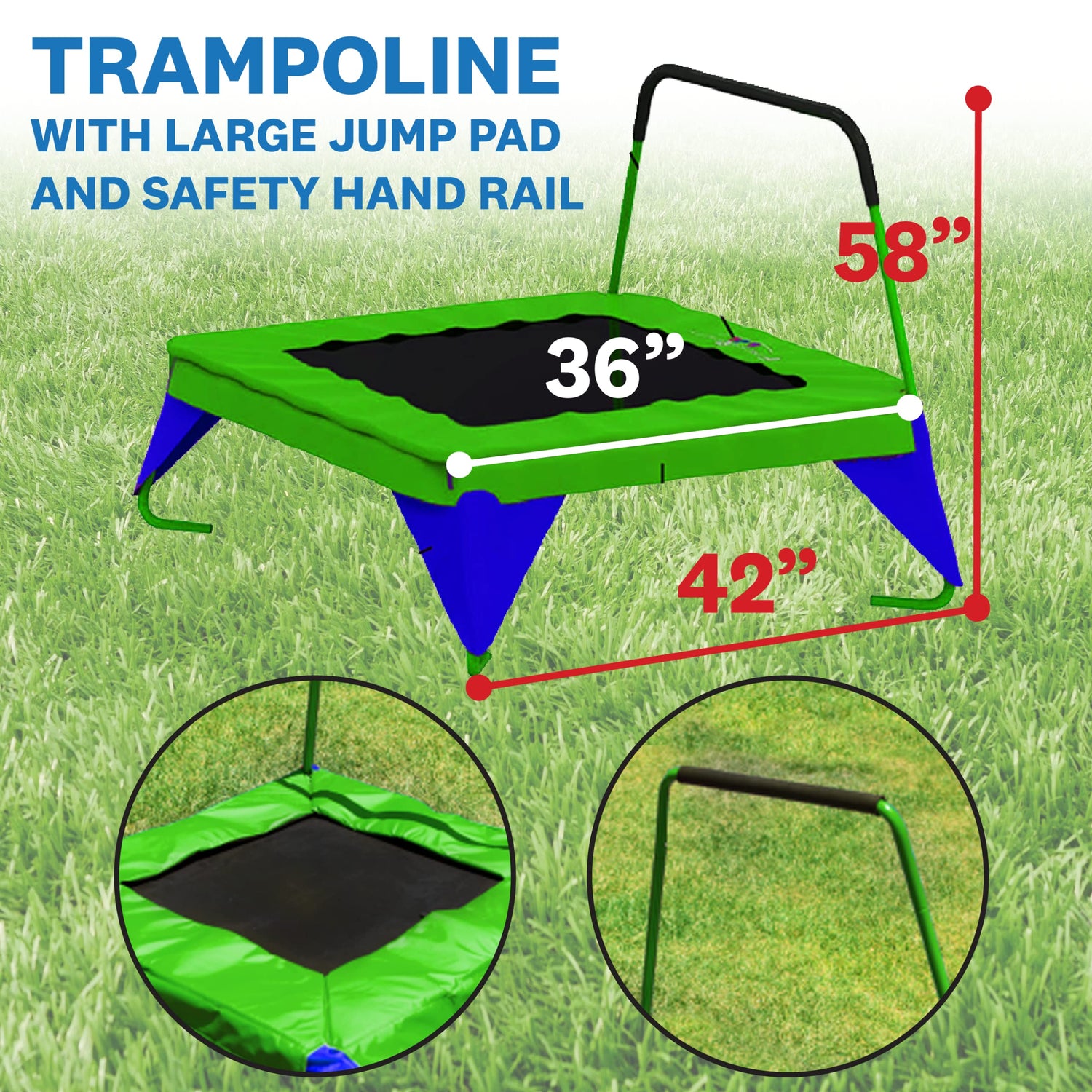 - EIGHT FUN STATIONS: This set comes with a 36" fitness jumper trampoline, a 32" flying saucer, a glider, a slide, monkey bars, a swing, a basketball hoop with a backboard, and a soccer goal with a net.