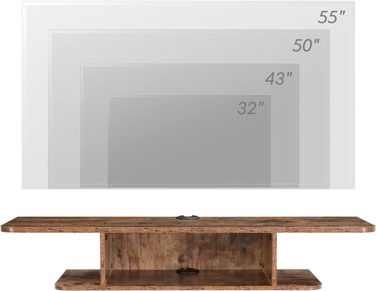- 【Durable & Stable】: This floating shelf is comes with mounting hardware for standard wood stud wall installation, includes a strong and tested metal hanging system to fix it on a wall, the floating tv console can hold up to 55 lbs, compliments a wall mounted television up to 50" (NOT MADE TO SUPPORT A TV).