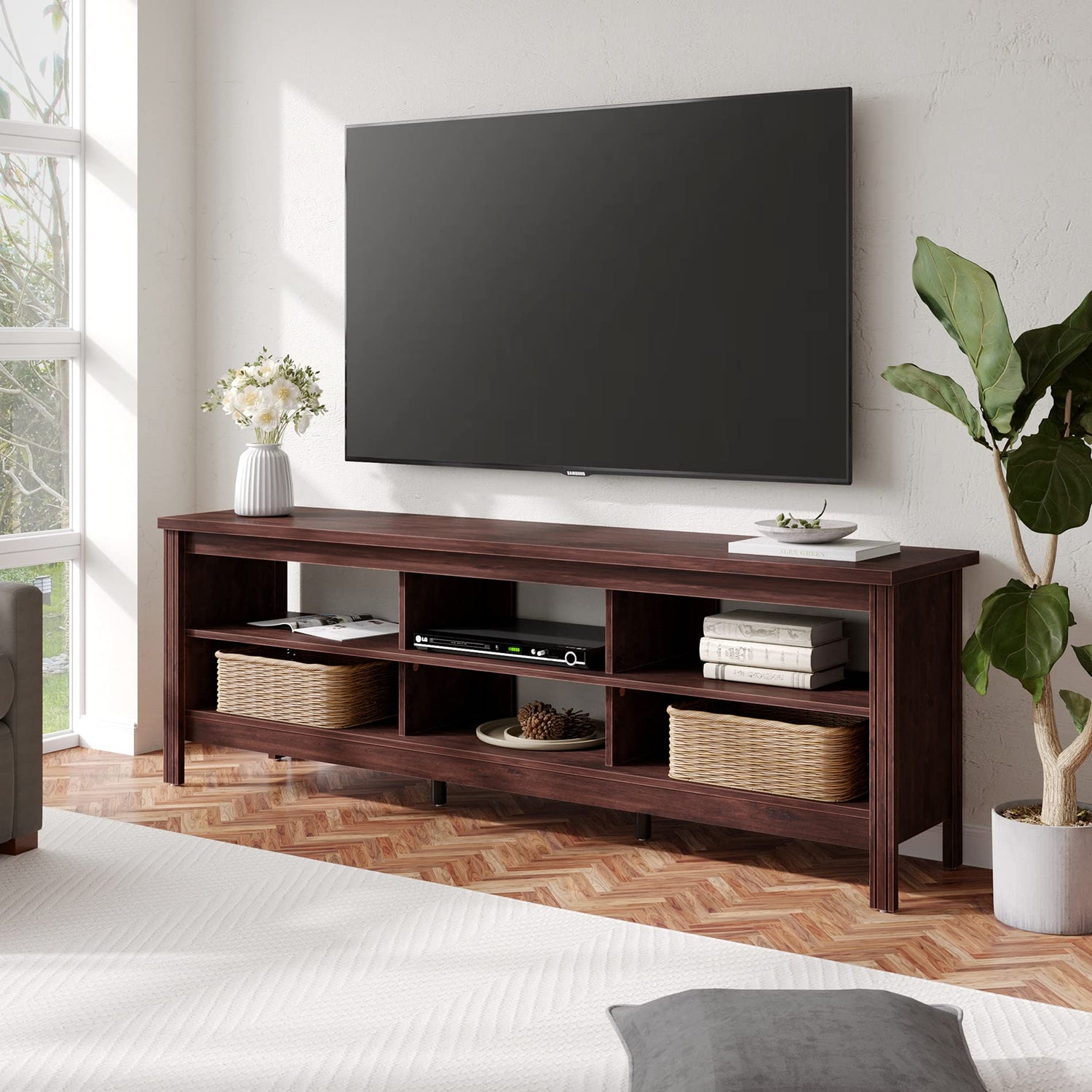 - 【Large Tabletop & Storage Space】Characterized by a wide tabletop, the television stands can accommodate TVs up to 75”, of course, it is also suitable for 50”, 55” 60” “65” flat screen. And the TV stand for 75 inch tv features 6 cubby to offer sufficient storage space to meet all storage requirements. Plus, the open storage shelf design makes it easy to display and take your things.