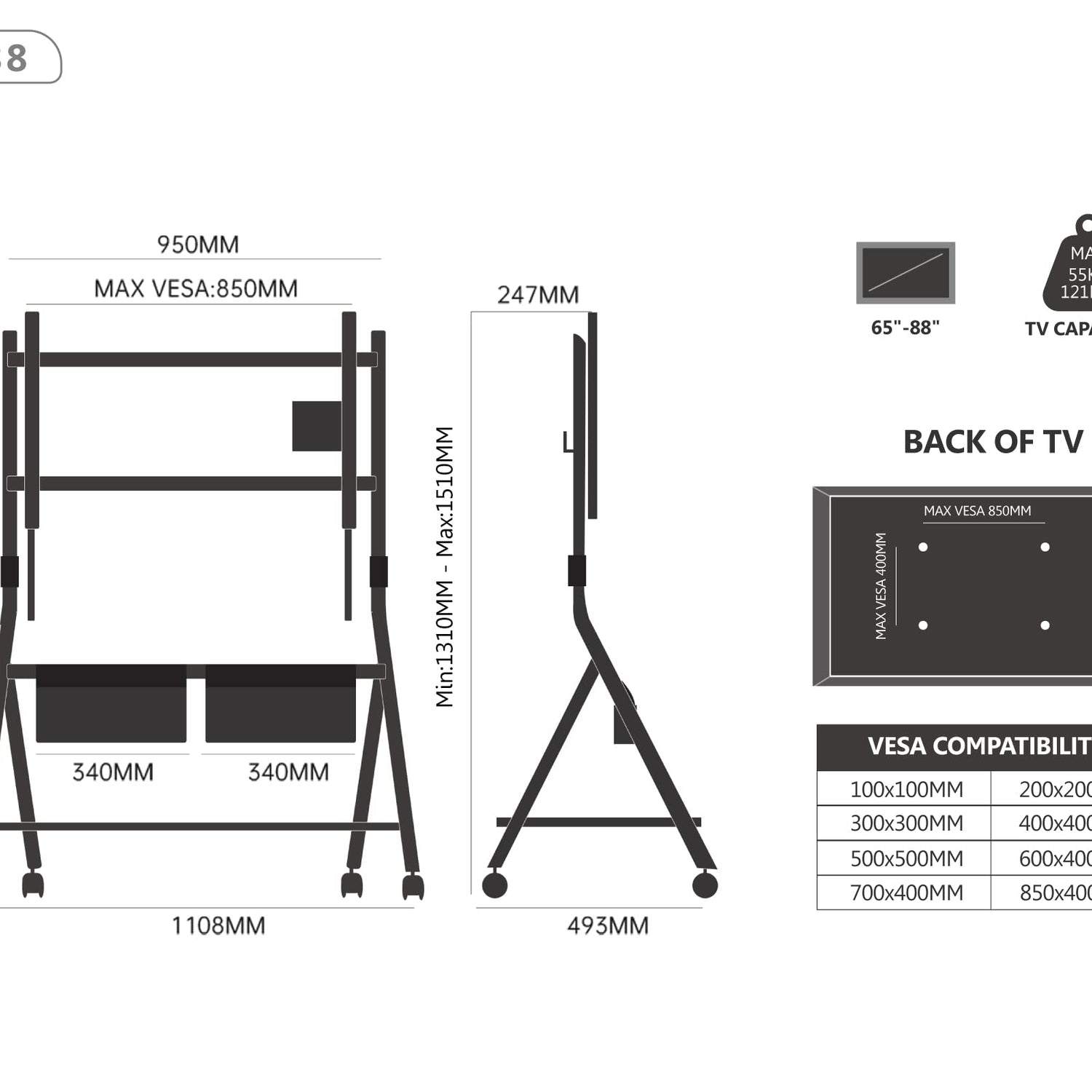 - Corner TV stand for 65"-88" TV: Designed for space-saving, this floor TV stand won’t take too much space as traditional TV cabinets do. But it features a weight capacity of 121lbs, so that this TV stand with mount will perfectly fit most 65”-88” TVs with 100x100mm-850x400mm VESA size. The upgrade metal frames provide stability support for the TV on wheels. The surface protection coating make sure the durability of this mobile TV stand