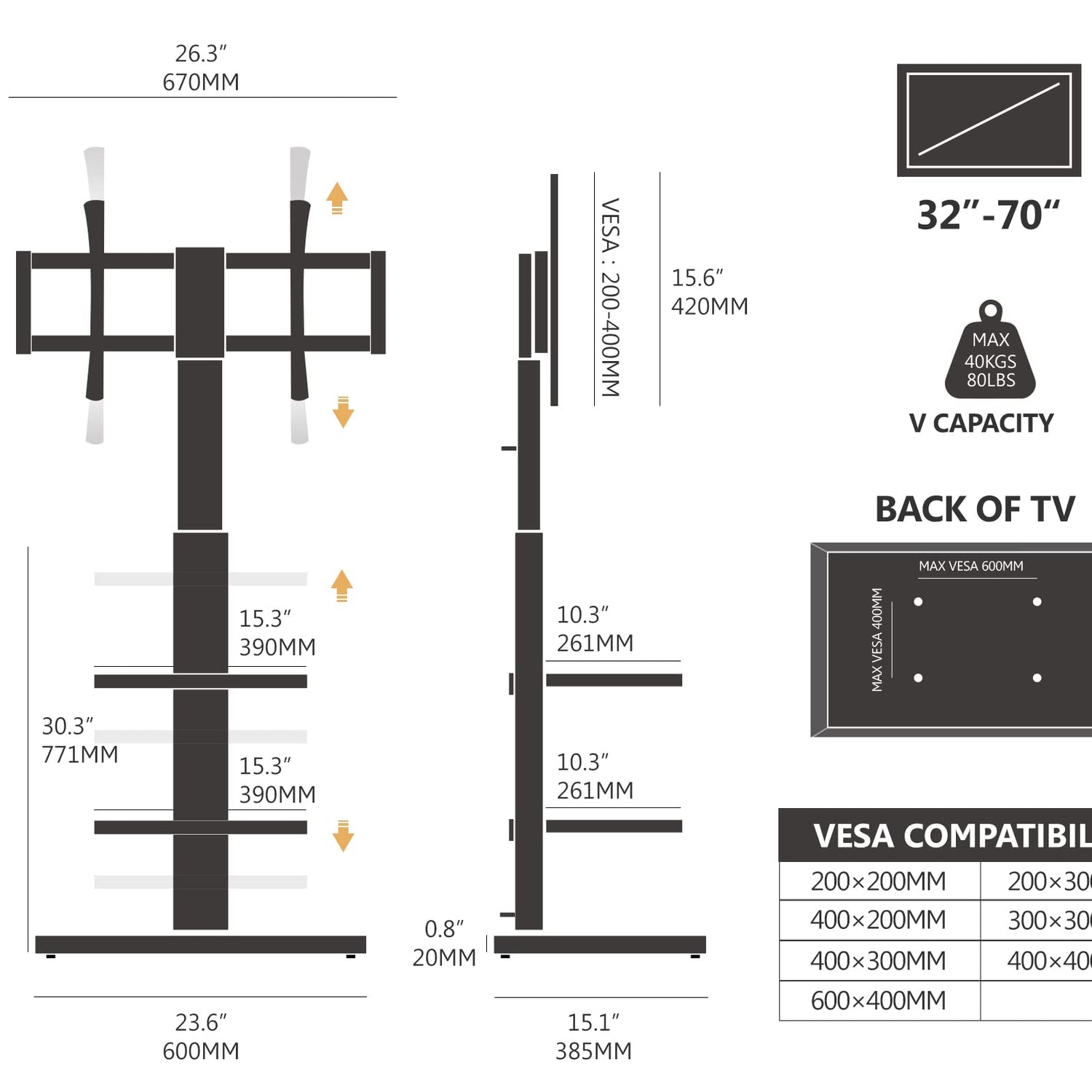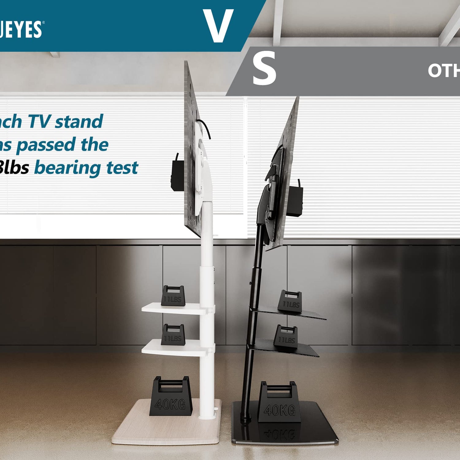 - MATCH the TV VESA & SUPPORT - Choose this TV floor stand right for Most 32 37 39 40 42 43 47 50 50 55 60 65 70 inch flat panel /curved screen TVs. Compatible with Samsung/Sharp/TCL/LG TVs etc. Make sure your TV stand mounting VESA is 200x200mm- 600x400mm. Then you will find this outdoor TV stand with 40kg/88lbs weight capacity perfect for your big TV