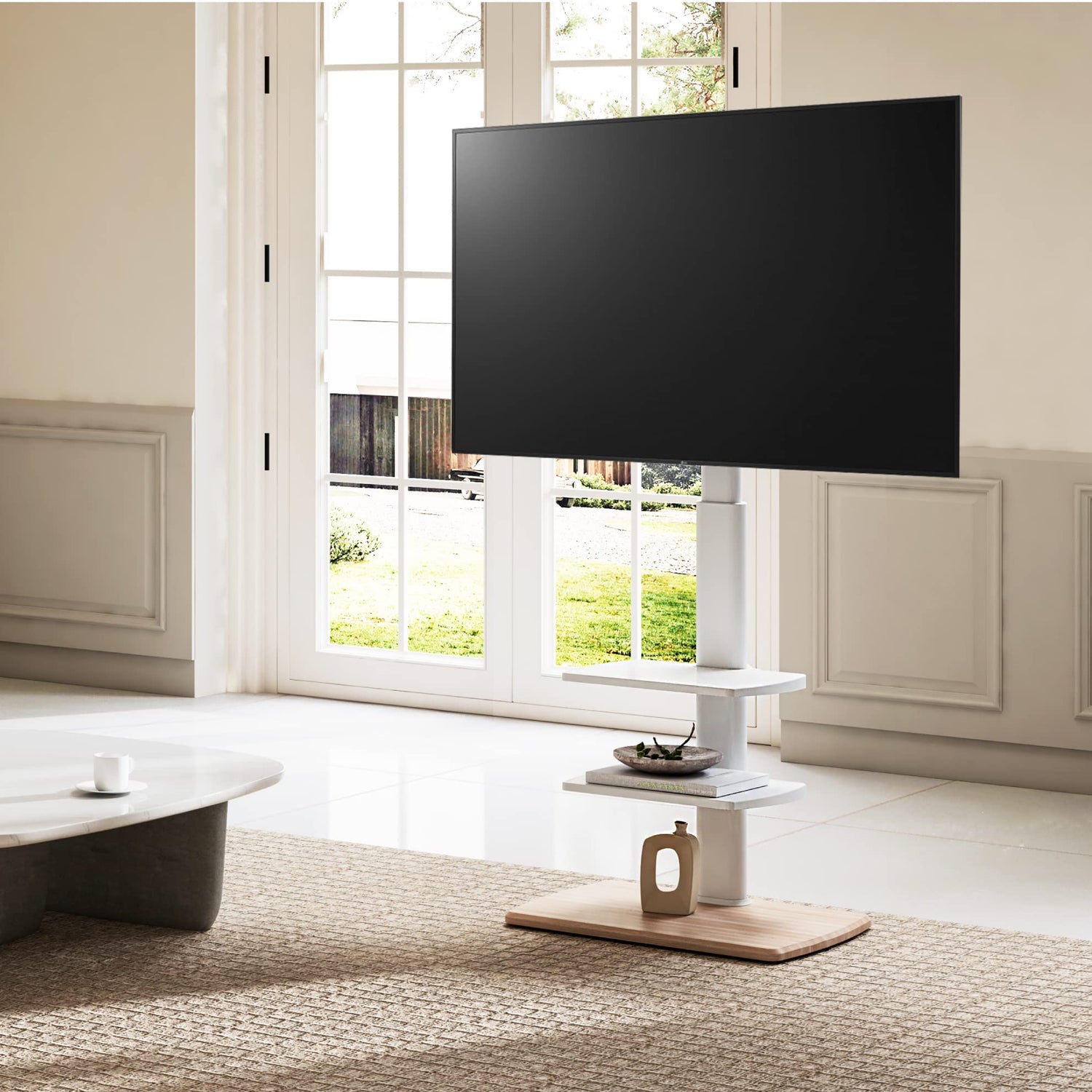 - VERSATILE TV FLOOR STAND - A corner TV stand lets TV fit a big display in a compact space. Unlike traditional TV cabinet being too heavy, this tall floor TV stand can be used as corner TV stands next to the bed, free up floor space and adding storage space. Modern white surface also fit your bedroom, Yoga room, Home office, etc