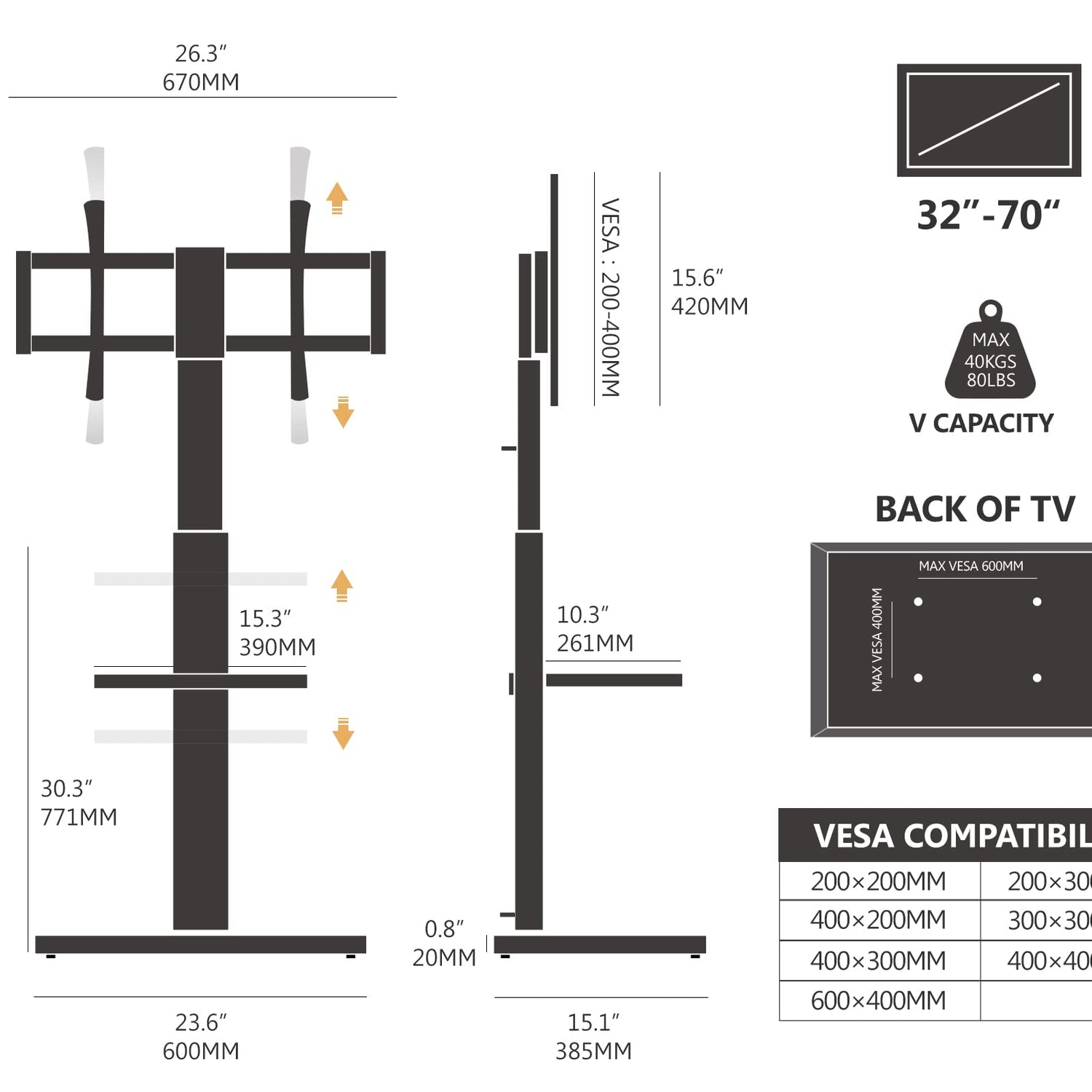 - NOTICE BEFORE BUYING: This floor TV stand fits most 32 to 70 inch flat-panel LCD/LED/Plasma TVs up to 88lbs. Make sure your VESA (mounting hole pattern) falls between: 200(w)x200(h)-600(w)x400(h)mm