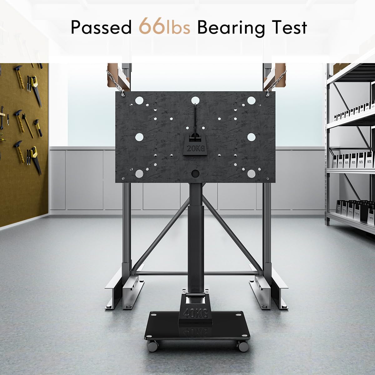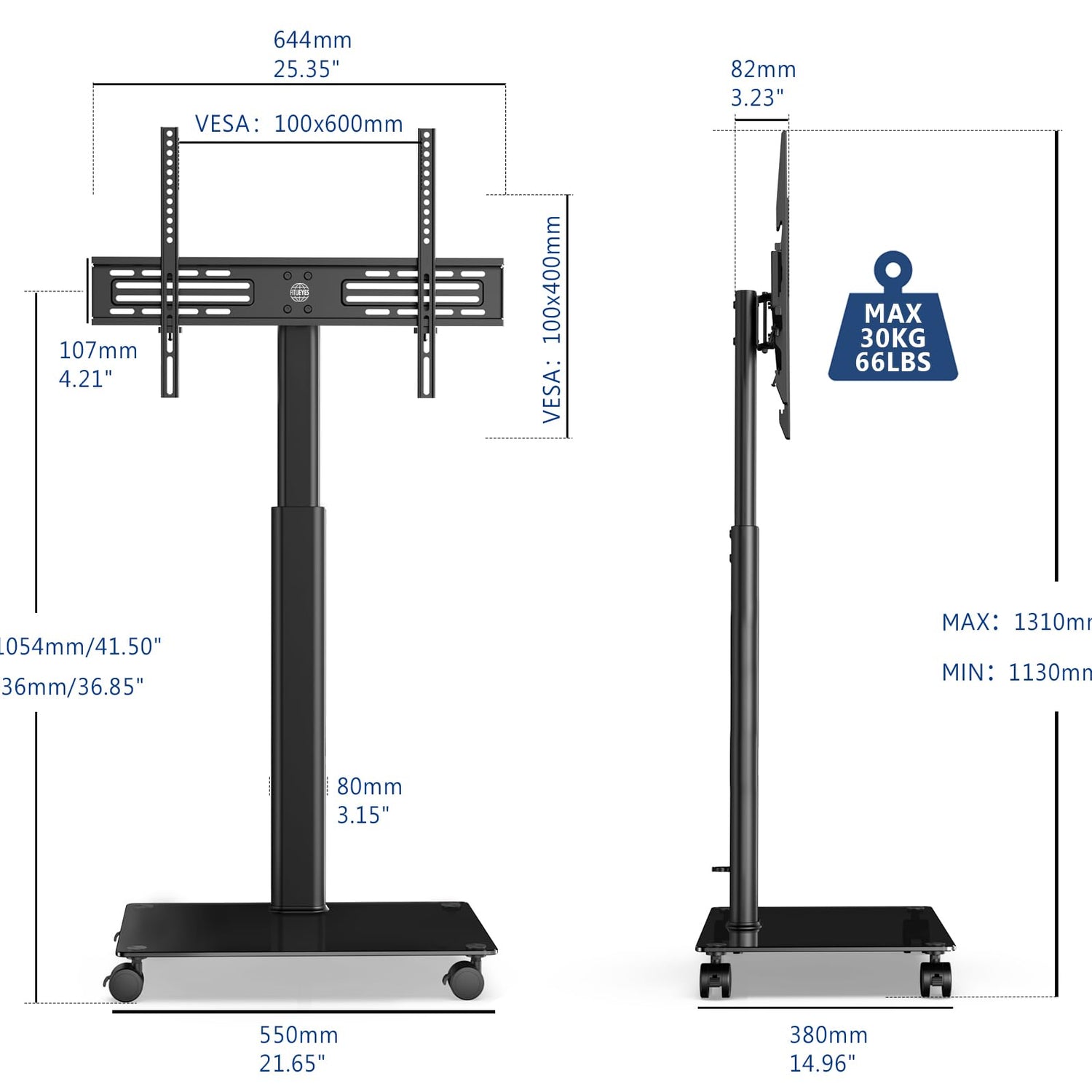 - UNIVERSAL TV STAND WITH WHEELS : Choose this mobile TV stand for most 32 37 39 40 43 47 50 55 60 65 inches flat curved screen TVs for Sony/Samsung/Sharp/TCL/ LG etc. The rolling TV stand with reinforced metal pole can bear 66lbs. This TV carts for flat screen TV fits VESA 100x100mm-600x400mm