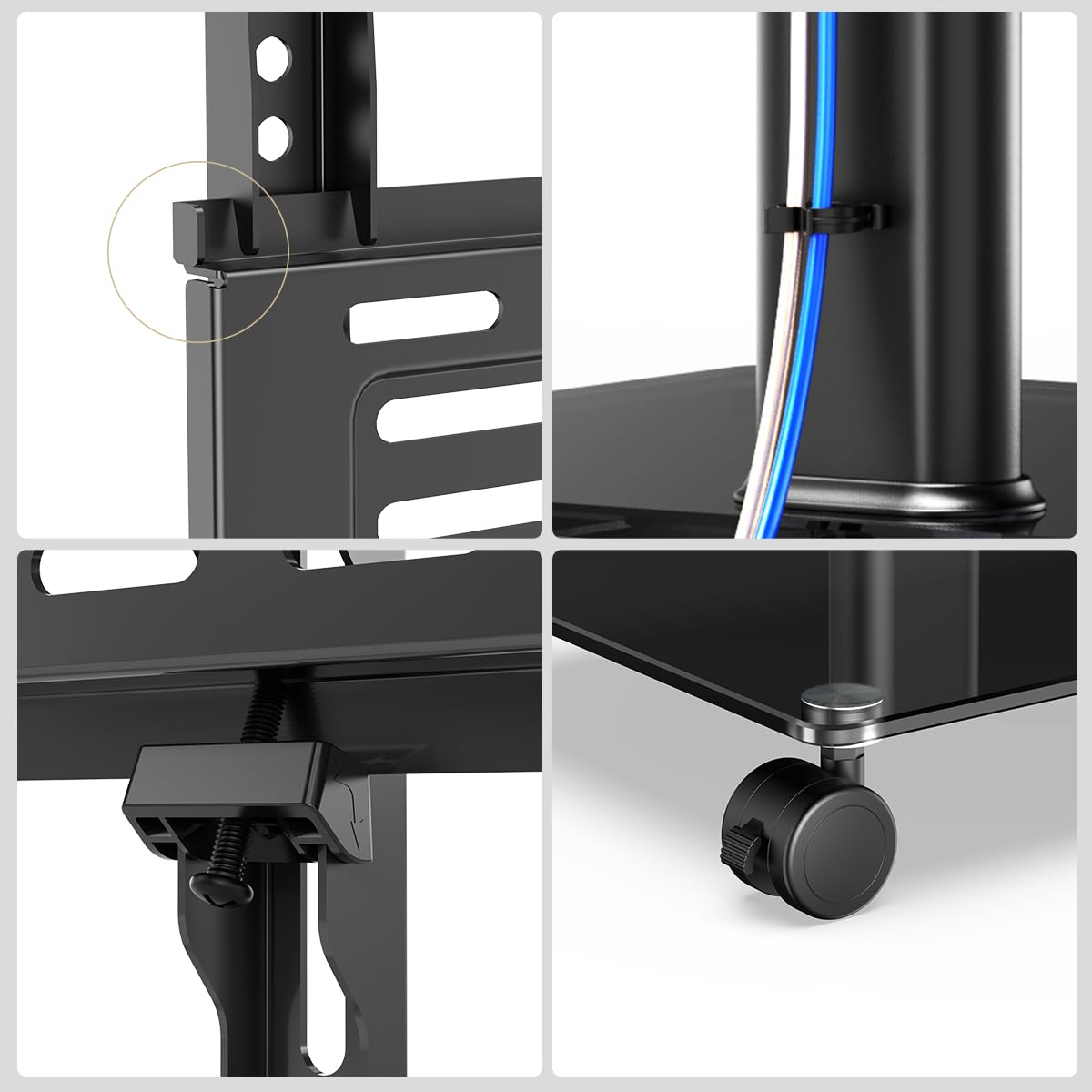 - WOOD-TEXTURED BASE & UPGRADE BRACKETS: Different from the fragile heavy glass base of similar TV floor stands. The wood-textured base provides stability for this mobile TV stand. Unique red & black hooks give this tall corner TV stand a simple and stylish appearance