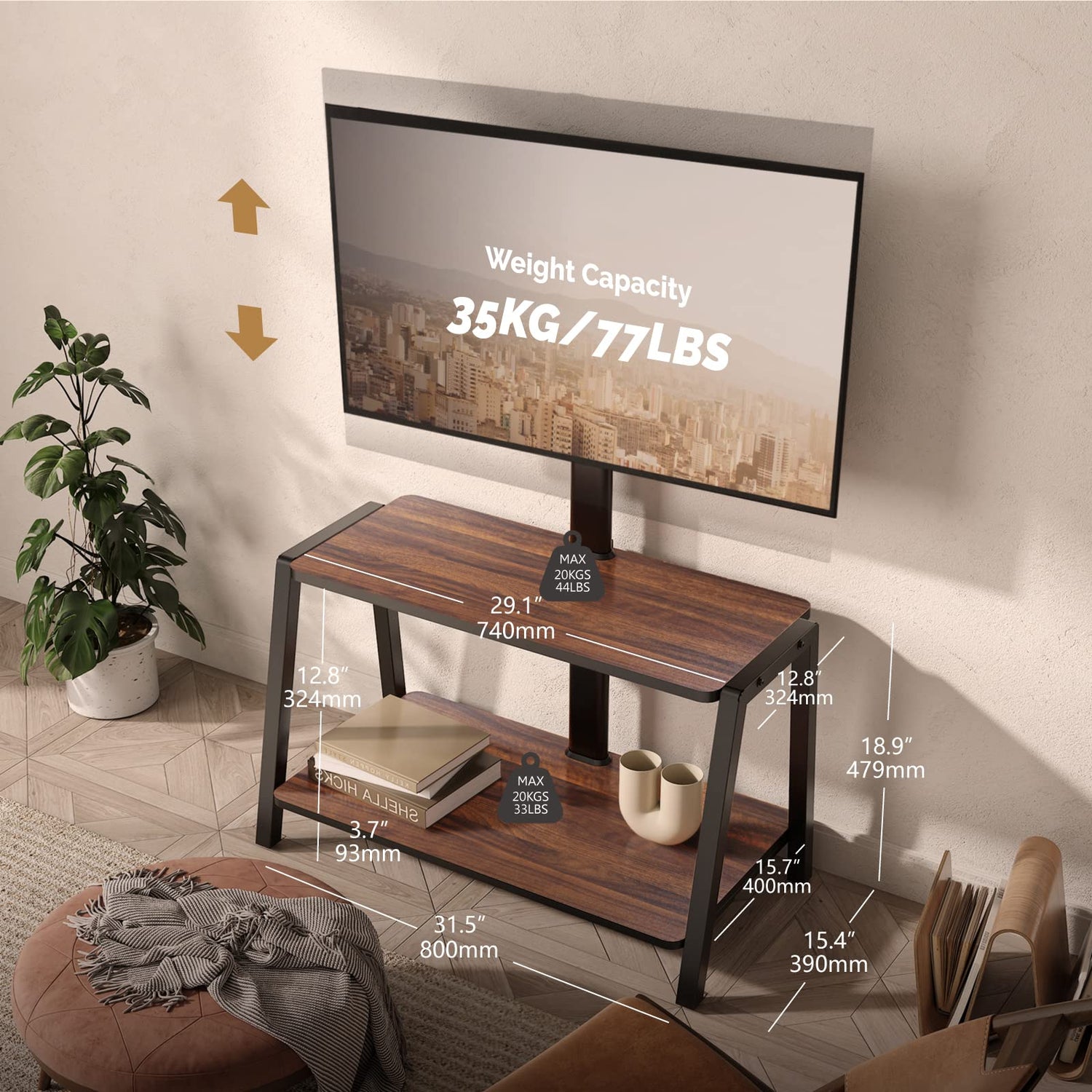 - MODERN AND MINIMALIST DESIGN: A tall TV stand fit for small loft, corner, bedroom, combined traditional Media Stand with TV Mount perfectly. Golden walnut board with sturdy metal frame makes modern looks, adjustable feet pads to keep stability on uneven ground. Make your Living room more modern charm!