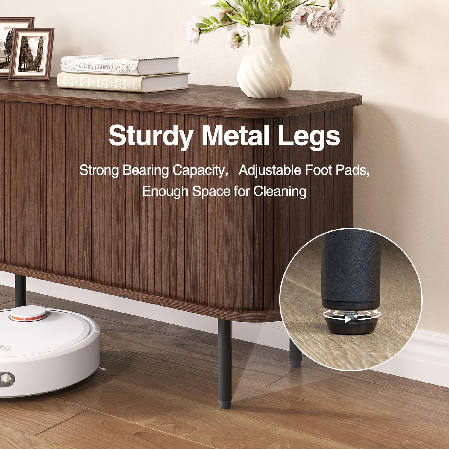 - Sturdy Material: The TV cabinet is made of engineered panel material. Sliding doors and metal handles are combined to incorporate natural tones that reflect modern and medieval charm. Multiple metal legs provide greater stability and robustness, while each leg is equipped with adjustable foot pads to accommodate uneven ground