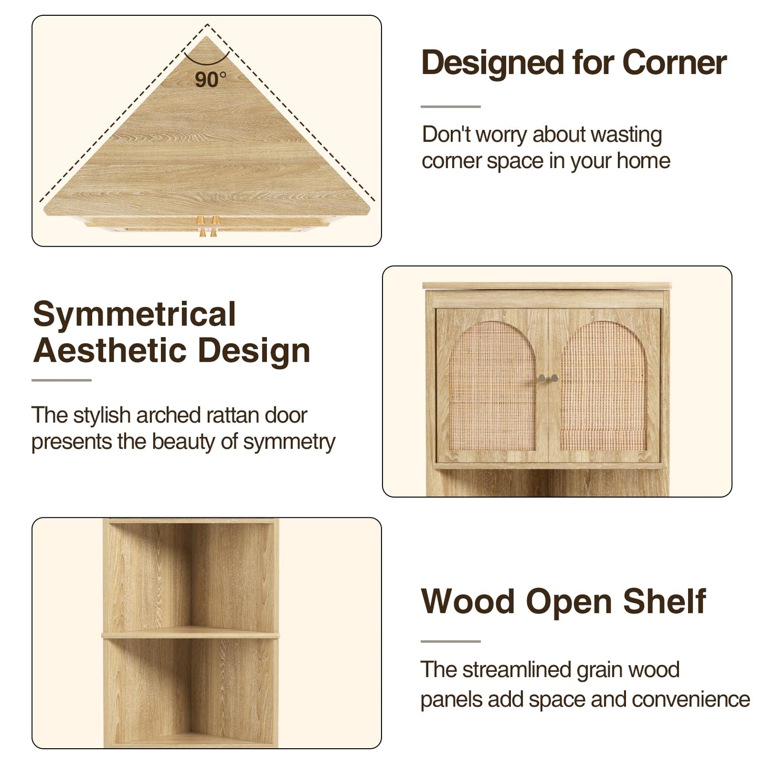 FiveWillowise 67''H Tall Corner Cabinet with Handmade Rattan Door, Rattan Storage Cabinet with Adjustable Shelves, Corner Bookshelf Space Saver for Barthroom, Kitchen, Natural