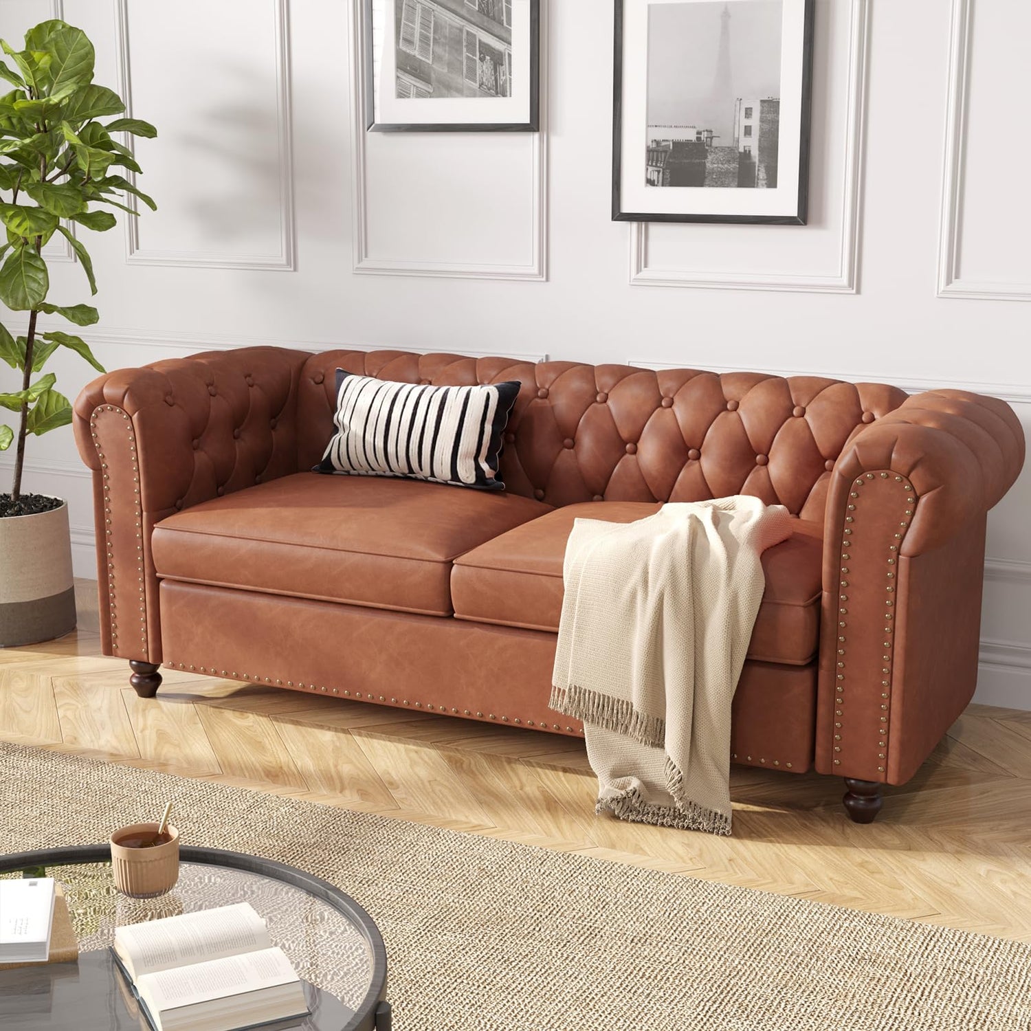 FiveWillowise 72 Inch Brown Couch, Chesterfield Faux Leather Sofa with Wooden Legs, Vintage Tufted Sofa with Rolled Arms, Mid Century Modern Couch with Rivets for Living Room, Apartment, Office