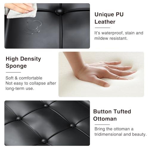 FiveWillowise Square Leather Ottoman with Storage, Faux Leather Coffee Table Ottoman with Lift Top, Large Upholstered Footrest Stool Toy Box Storage for Bedroom Living Room, Black