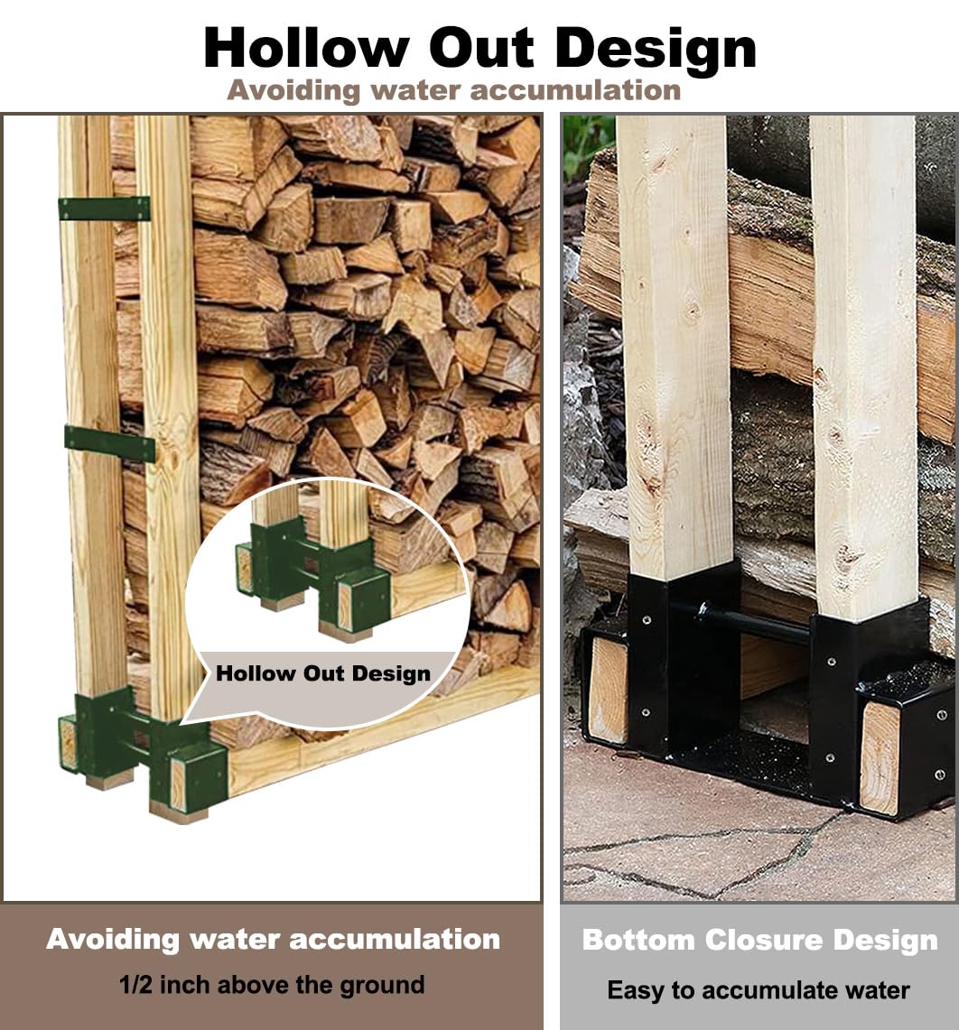 - HOLLOW OUT DESIGN -- Compared to other metal firewood support frames with closed bottoms, we utilize a hollow out design. During assembly, you can allow the wood to extend an additional 1/2 inch beyond the firewood rack brackets 2x4 storage rack, thus avoiding the rack water accumulation and direct contact with the ground, thereby increasing the lifespan of the wood holder.