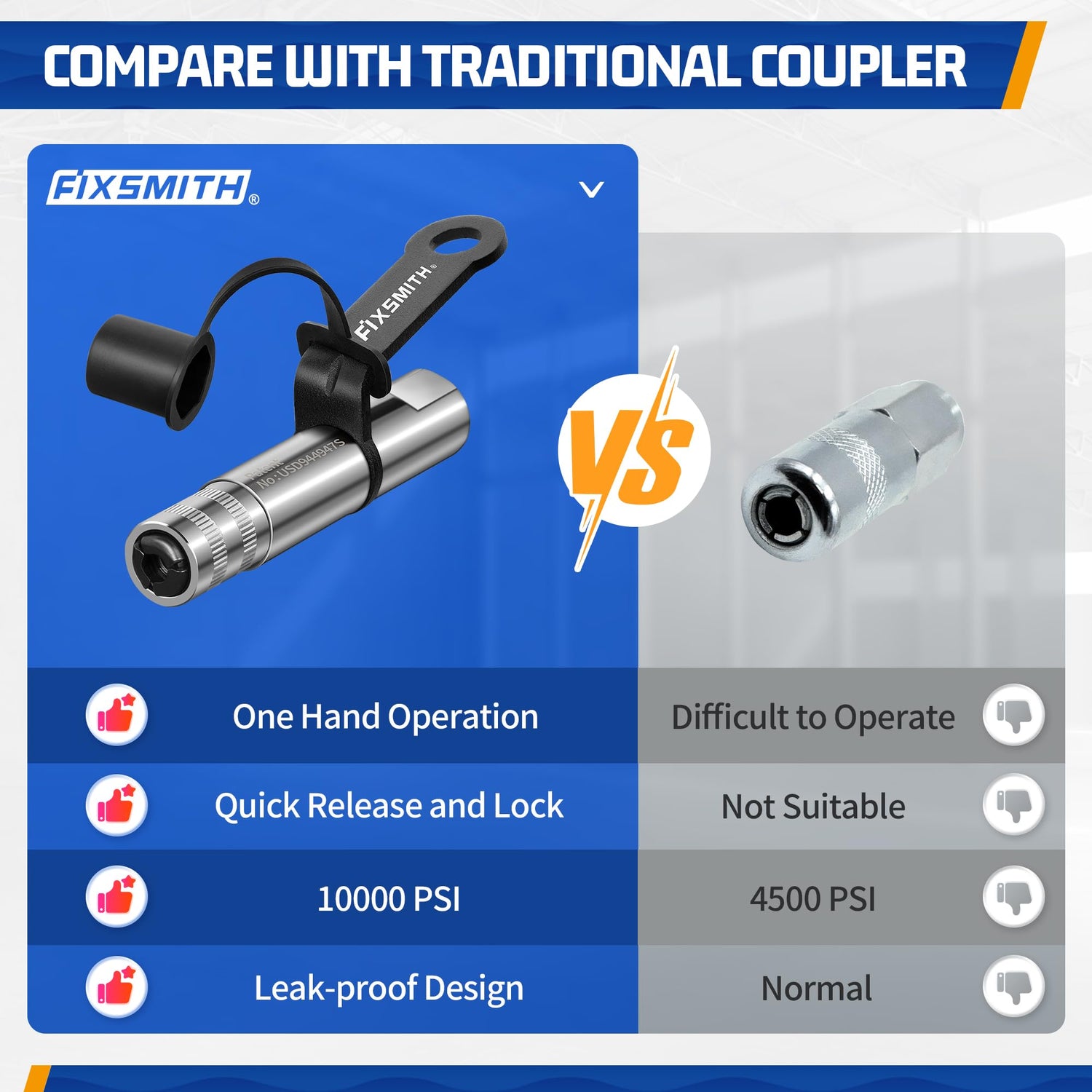 - LOCK AND SEAL】FIXSMITH professional grease gun coupler features an innovative exclusive patented design, delivering utmost safety and reliability with its exceptional quality assurance. Its reinforced 3 jaws and unique sealing gaskets ensure a secure connection to Zerk fittings, preventing grease gun tips from detaching and effectively eliminates any risk of leakage even under high pressure of up to 10000PSI.