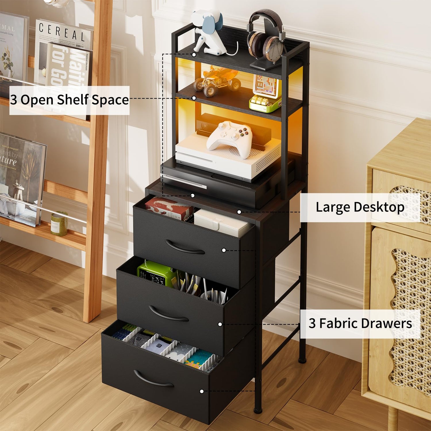 Fixwal 41 Inch Tall Nightstand with Charging Station, Led Night Stand with U-S-B Port & Socket, 3 PU Finished Fabric Storage Drawers, Office, Bedside Table & Bookshelf in One, Black