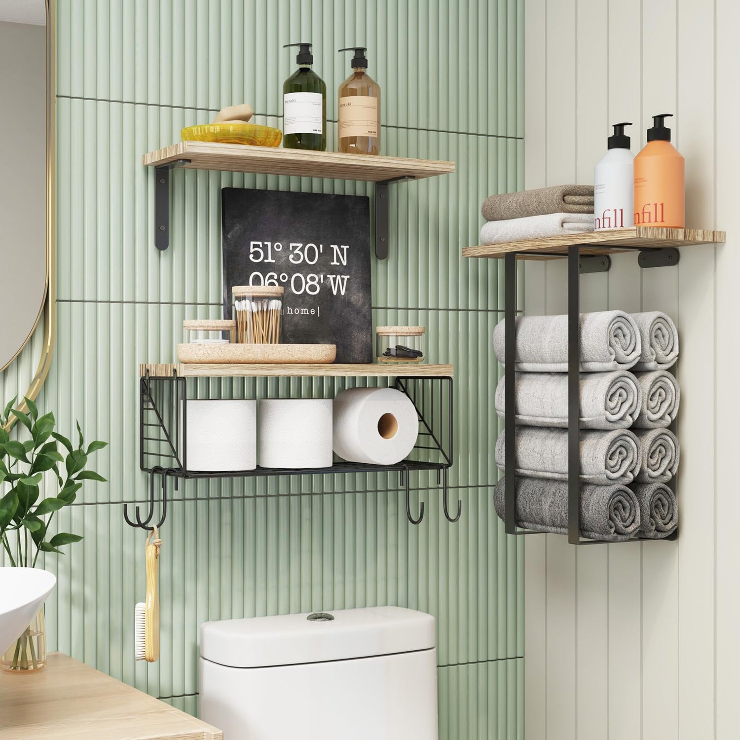 - [Bathroom Wall Décor 3 Set]- Fixwal Farmhouse style bathroom wall décor sets included: floating shelves & towel storage rack & bathroom floating shelves with basket to fulfill both your decorative and organizational requirements. The premium rustic wood showcases the farmhouse style, bringing a touch of nature to your home.