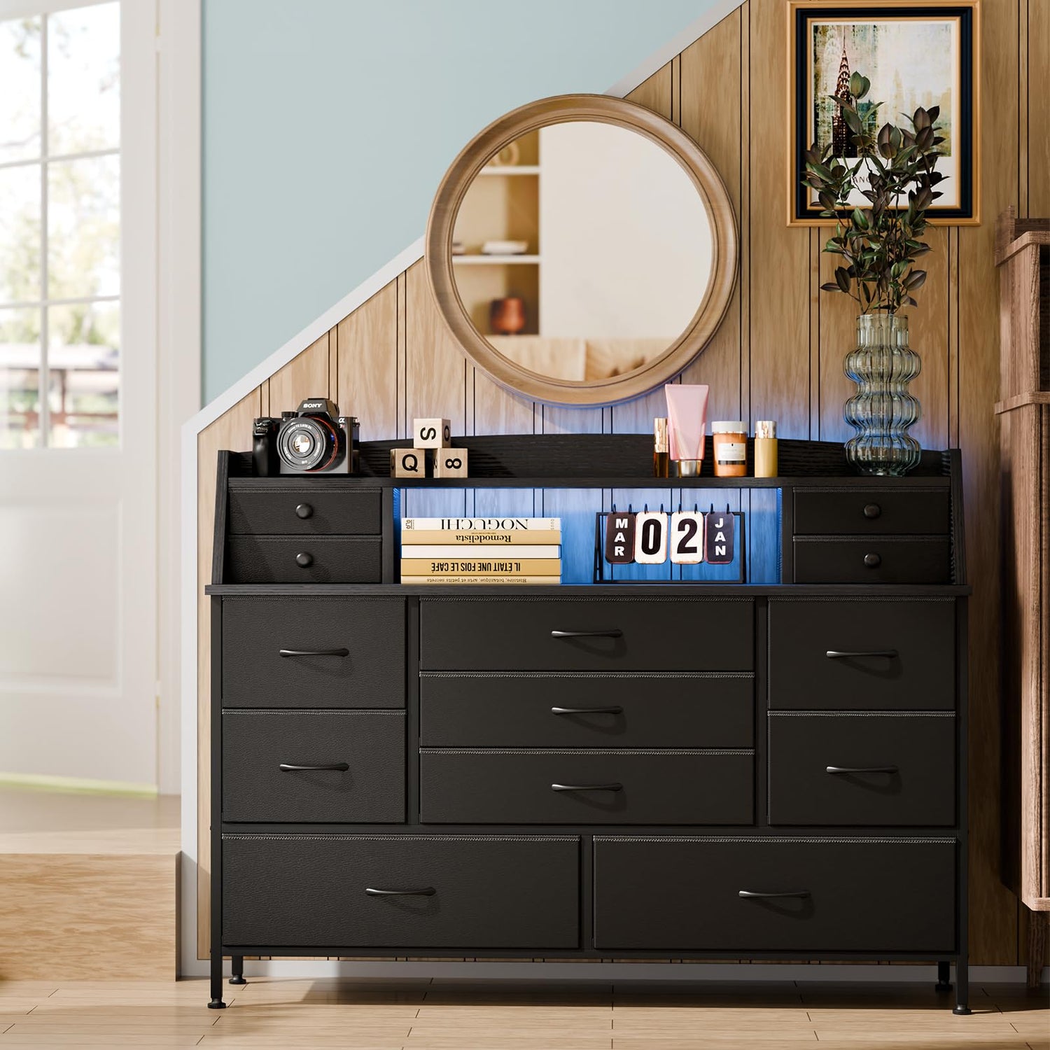 - 【Additional Top Space】The raised edge and small drawers add space to the top to organize and display your favorite decorative pieces. The modern design is perfect for placing daily essentials such as cosmetics, lamps, and eyewear, keeping everything within easy reach and transforming your dresser into a personalized dressing station.