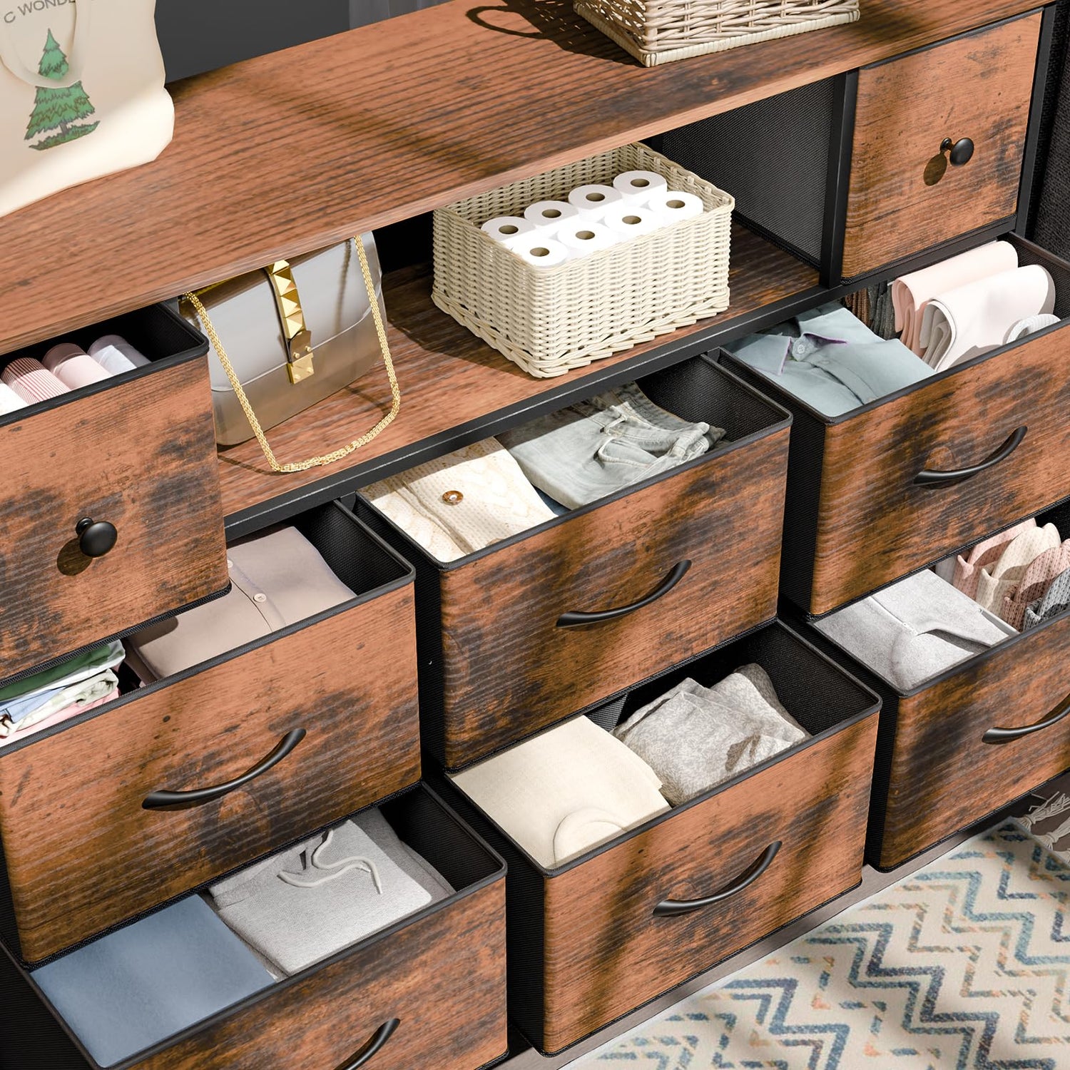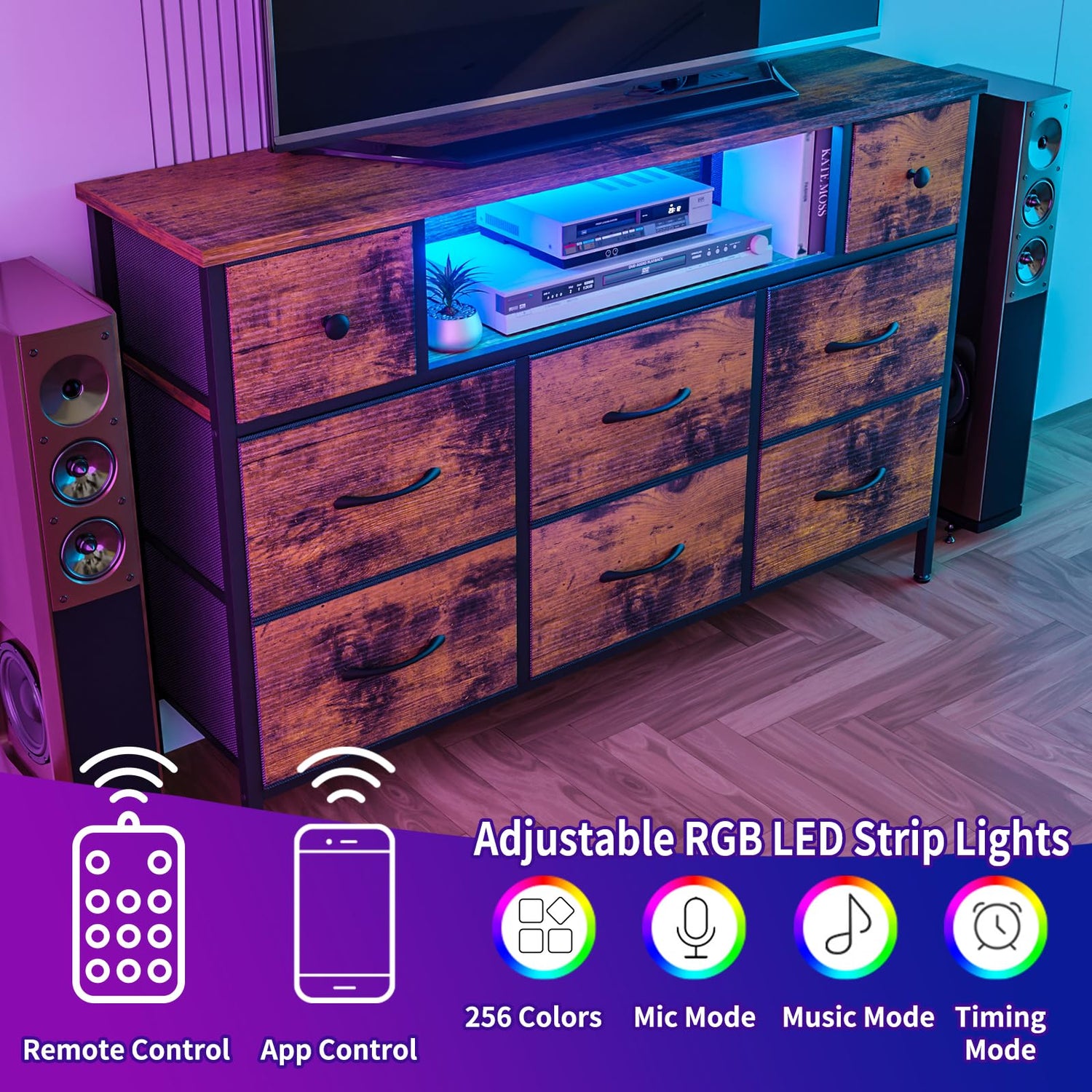 Fixwal Dresser for Bedroom with Power Outlets and LED Lights, Rustic Brown 55" TV Stand with 8 Drawers, Fabric Chest of Drawers with Wood Grain Finish for Entryway