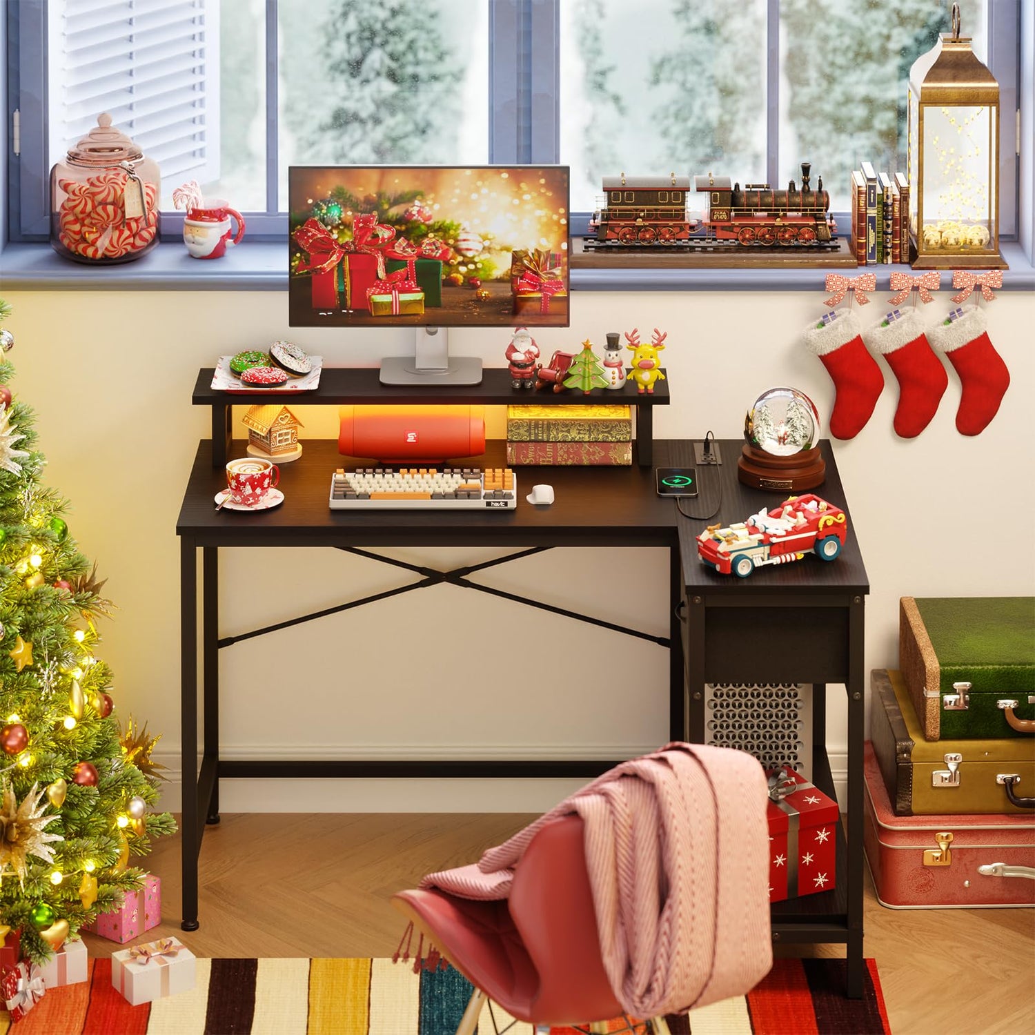 Fixwal L Shaped Gaming Desk with Power Outlets and LED Lights, 43 Inch Computer Desk with Charging Port, Small Corner Desk Table with Drawer and Shelf, Home Office Desk with Monitor Stand, Black