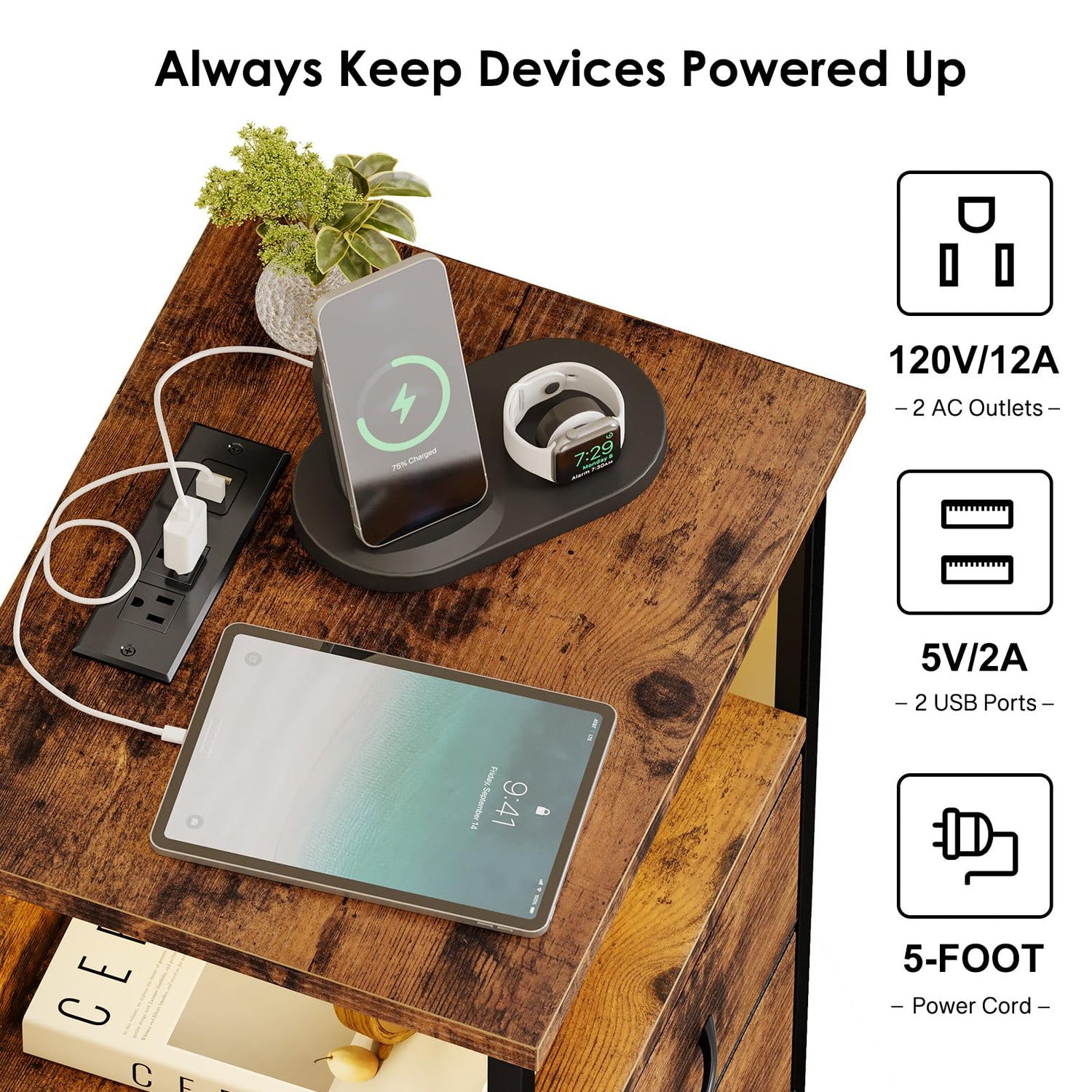 - 【Night Stand with Charging Station】 - This bedroom end table comes with 2 AC outlets and a 5 ft long power supply cord. You can easily connect and charge electronic devices, such as smartphones, tablets, desk lamps, and other mobile devices, with everything within reach. Say goodbye to the trouble of insufficient sockets and wake up to enjoy a worry free charging experience.