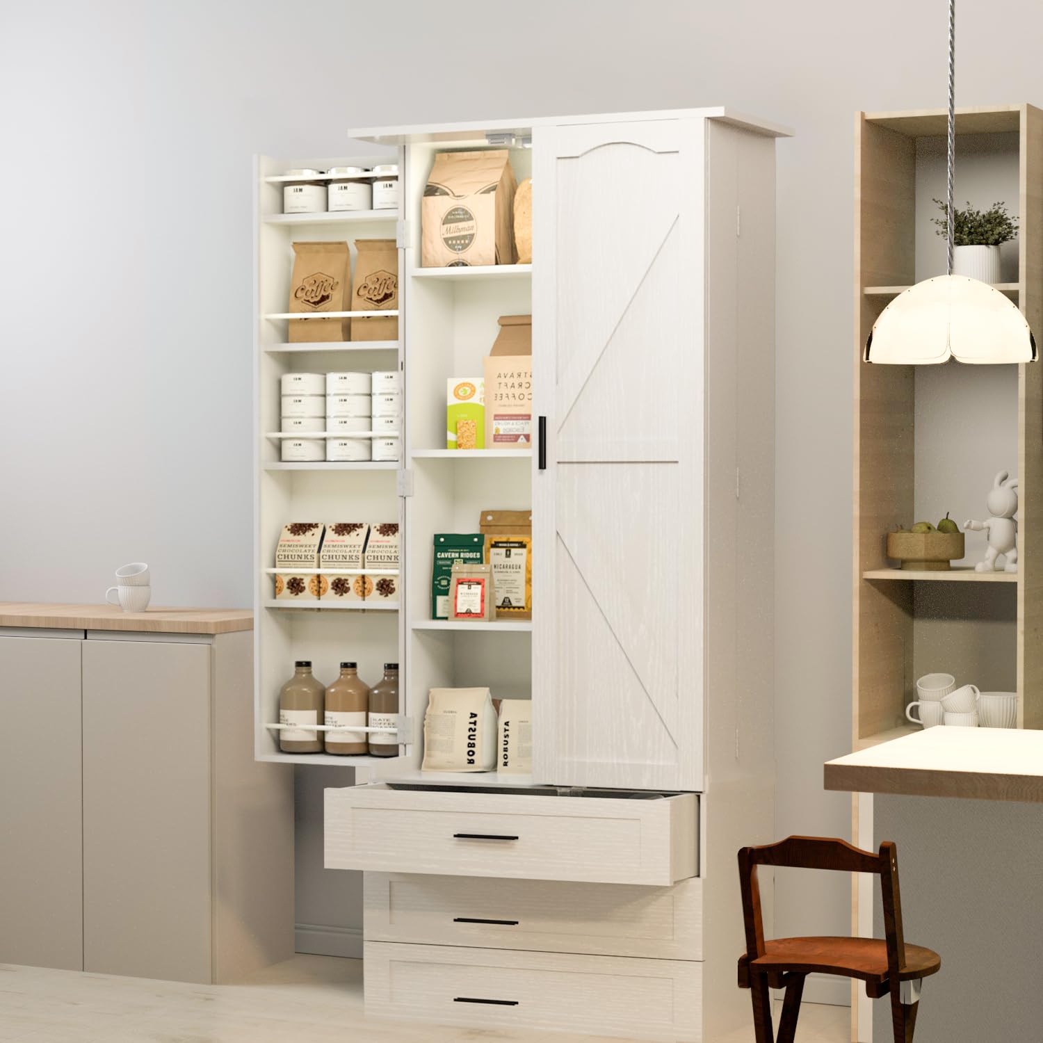 FJTJBSI 72" LED Kitchen Pantry Cabinet with 3 Drawers Farmhouse Tall Storage Cabinet Wood Food Pantry with Barn Doors and Adjustable Shelves Versatile Storage Freestanding Cupboard for Kitchen