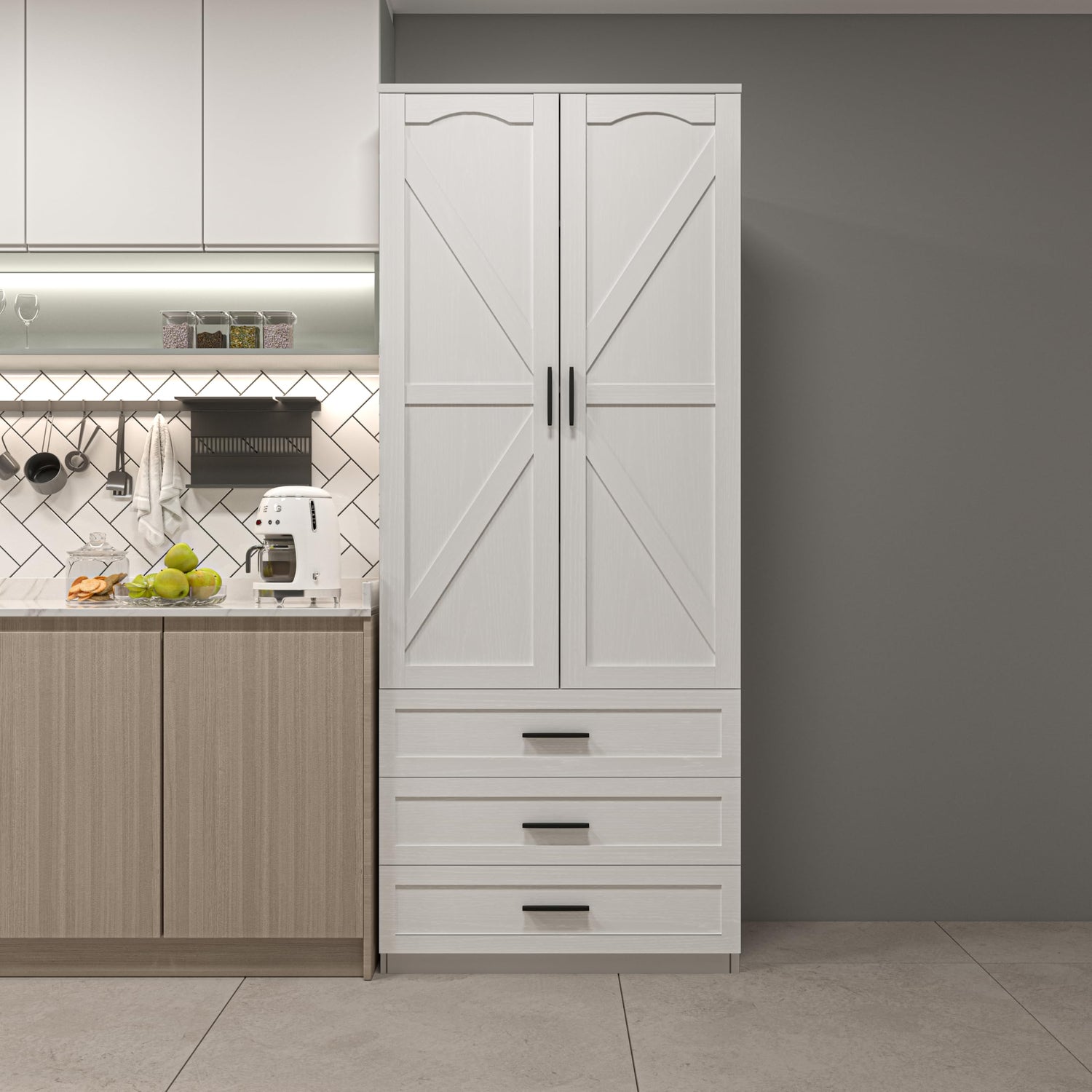 - 【Elegant Farmhouse Style】 Our tall kitchen cabinet comes with two barn doors in a simple wood grain finish with black metal handles, the modern farmhouse style of this cabinet will match any decor and furniture.