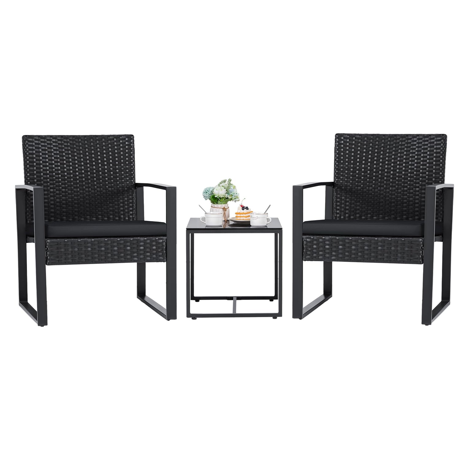 Flamaker 3 Pieces Patio Set Outdoor Wicker Furniture Sets Modern Rattan Chair Conversation Sets with Coffee Table for Yard and Bistro (Black)