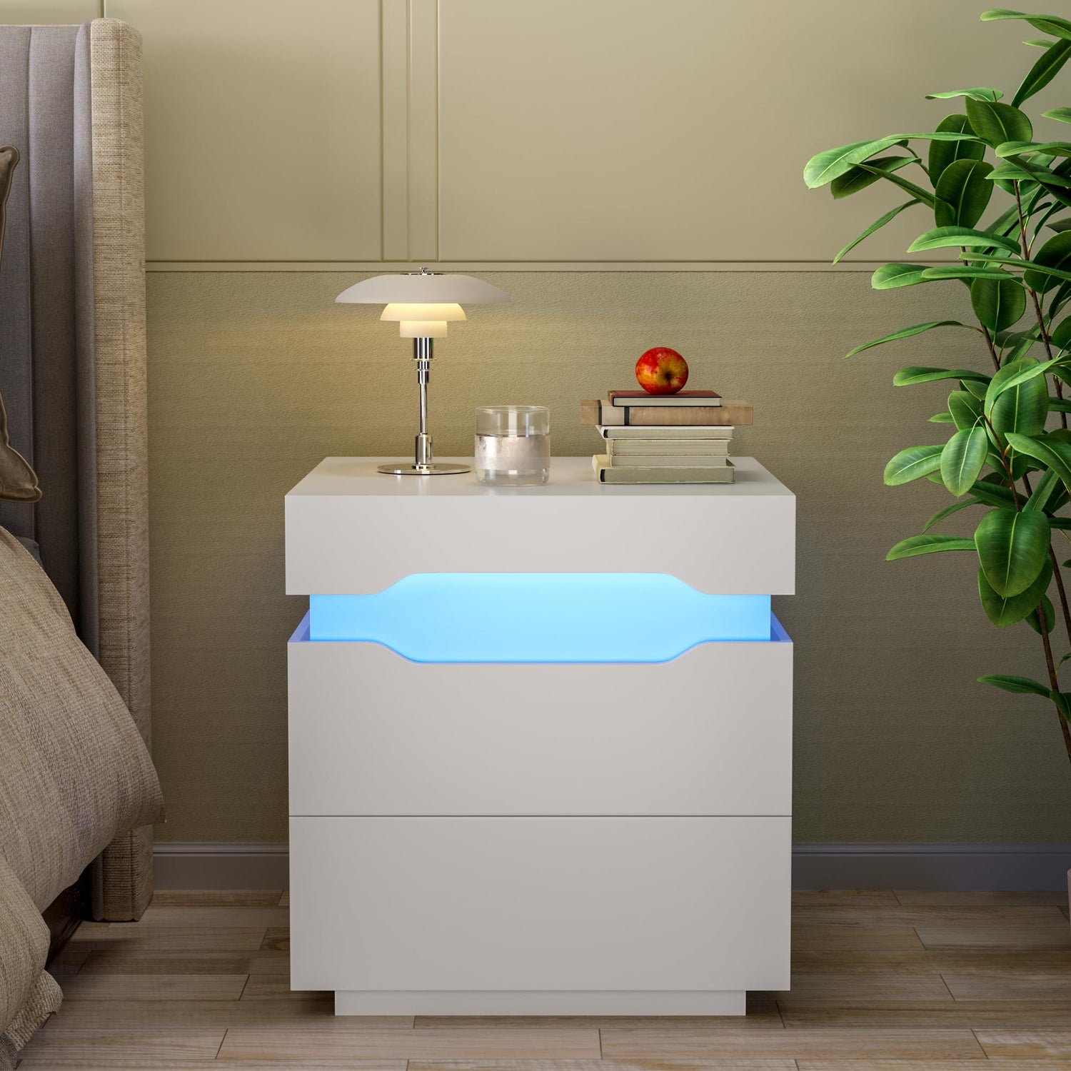 With two built-in drawers, this modern nightstand provides customers with ample storage options. The top tabletop can hold an alarm clock, photo frame or watch. Incorporating a modern design, the White LED Nightstand interprets your lifestyle with stylish styling, and its elegant look adds a lot of charm to the bedroom.