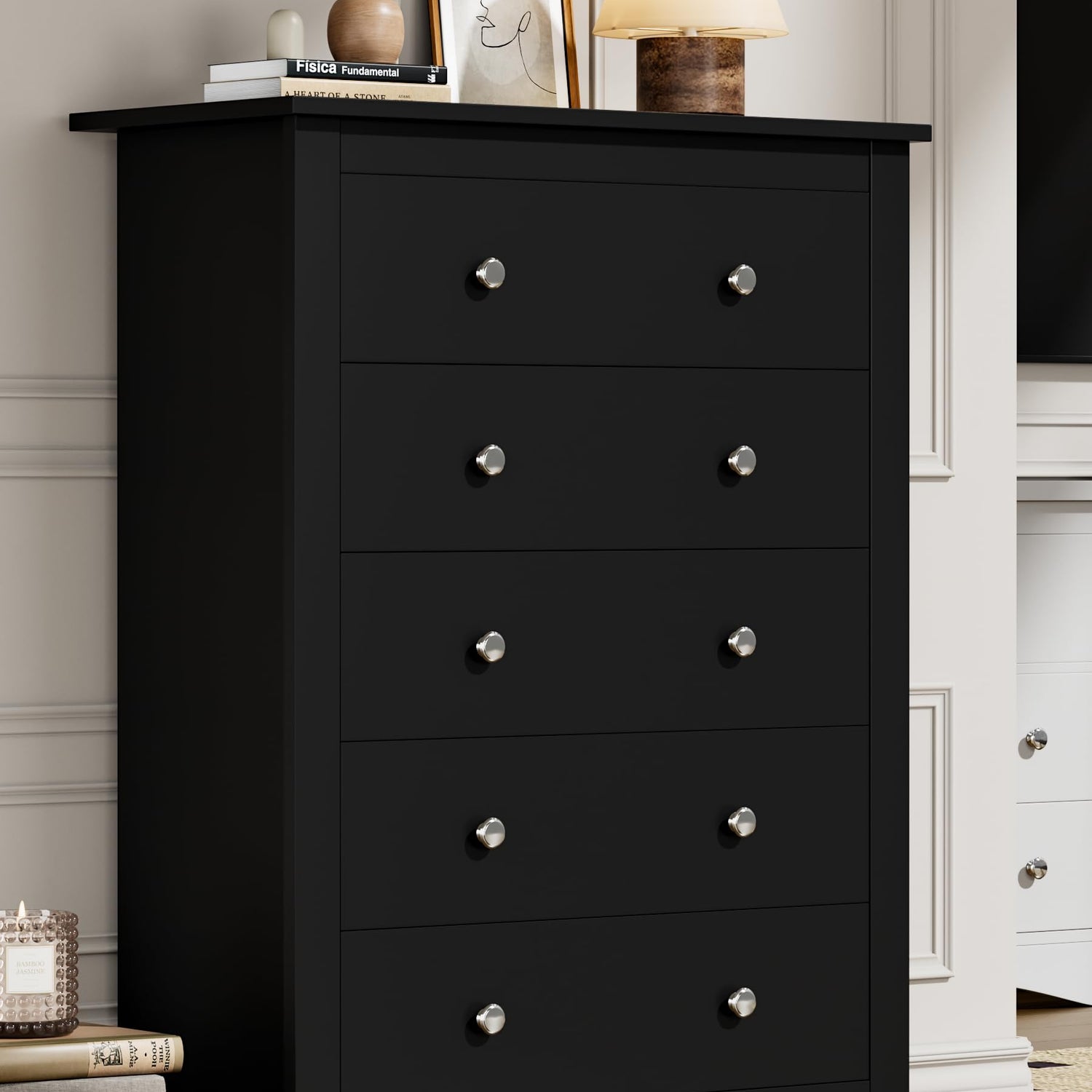 - Large Storage Capacity: Featuring five spacious drawers with premium wooden drawer panels that offer strong load-bearing capacity and smooth, effortless opening. Each drawer provides ample storage space for effortlessly organizing clothes, documents, or daily essentials, keeping your home tidy and orderly.