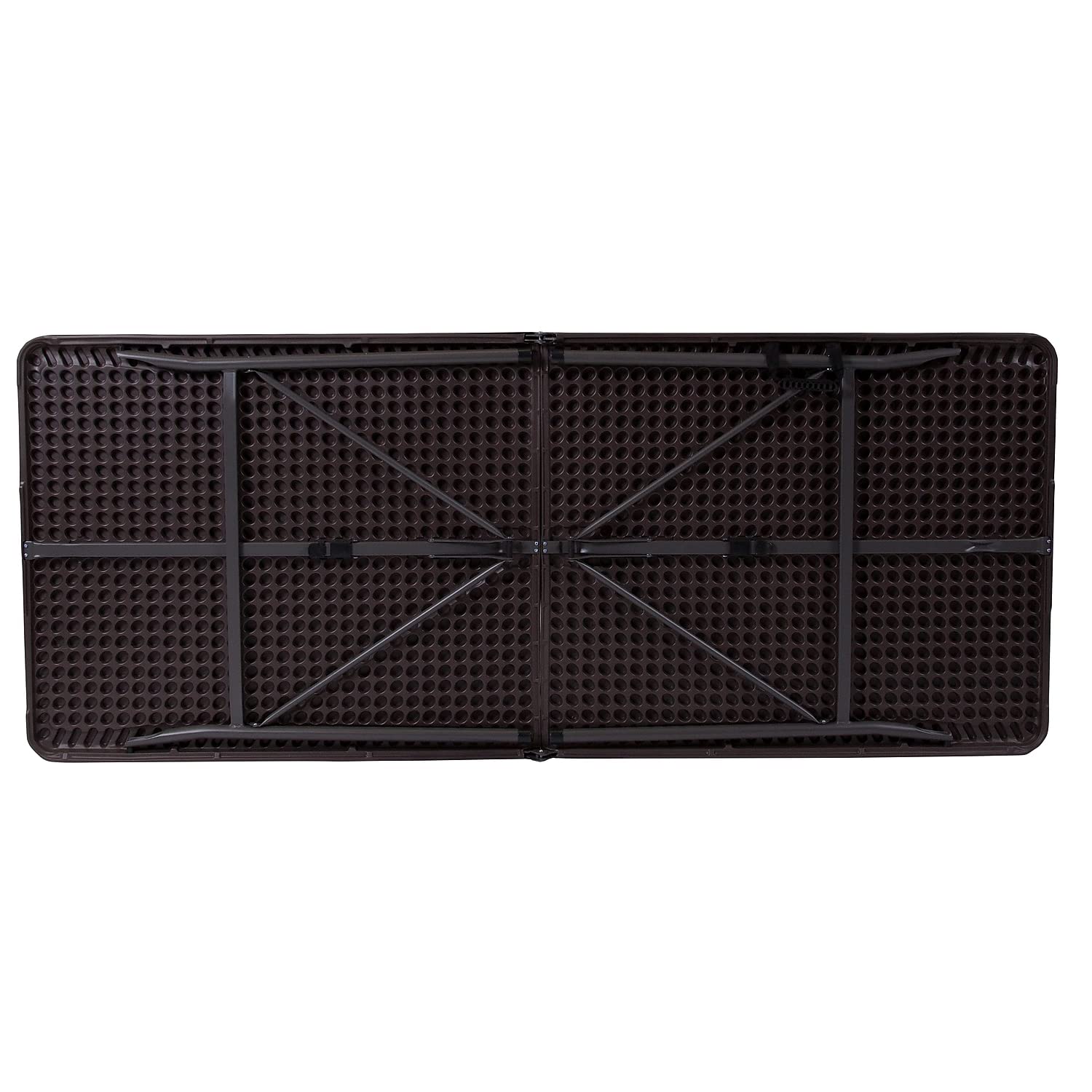 Details: Take the stress out of hosting and say hello to the perfect solution for your seating crisis! This bi-fold plastic folding table is a great option when you need a temporary dining surface or an everyday workstation in your home or office. This versatile folding table can be dressed up or used as is with its dark colored top during holiday events, parties and arts and craft activities. Place multiple tables side by side or in rows to accommodate large party events. The waterproof, impact and stain resistant top have a 220 pound static load capacity and is commercial rated for use as a training table, in banquet halls and at trade shows. The thick, dark gray tabletop is 6' long, 1.5" thick, and will seat up to 8 adults. Attractive gray powder coated legs lock securely in place while in use and non-marring floor caps protect your floor by sliding smoothly when you need to move the table. This durable, easy to clean table folds in half, making it easy to store and transport, using the convenient carrying handle attached on the side. The 30"W x 72"L Bi-Fold Dark Gray Plastic Folding Table with Carrying Handle is perfect for in-home events or on the deck or patio while entertaining during a barbeque. Designed for both indoor and outdoor use, store table indoors and protect the frame from extreme moisture. Rectangular folding tables offer the best solution for your home or business.