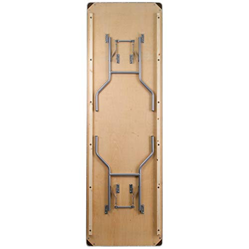 Details: Always be ready for your next event or get-together with the Flash Furniture Fielder 8' Folding Banquet Table. Whether you're hosting a home, school, or business event, this wooden event table offers a reliable, on-demand, and stylish solution for when you need a little extra surface space for your guests. It comfortably seats up to 10 people, making it great for a variety of settings such as parties, conferences, family barbecues, trade shows, corporate events, reception areas, training rooms, banquet venues, and much more. The heavy-duty wishbone legs conveniently fold under the table for easy transportation and compact storage after use, and the non-marring floor caps on the bottom of the locking legs protect your flooring surfaces. Constructed with a 0.75" thick plywood top with an extremely durable birchwood hardwood surface and thick aluminum metal edging, this folding event table adds elegant style to all of your special events and withstands years of quality use. It can be used as is or dressed up with a tablecloth to achieve a custom look. This banquet table can support up to 661 pounds of static weight and measures 30"W x 96"D x 30"H with no assembly required, so you can start setting up for events right away. As needed, the low-maintenance rectangular folding table can be cleaned with a solvent-based cleaner without water.
