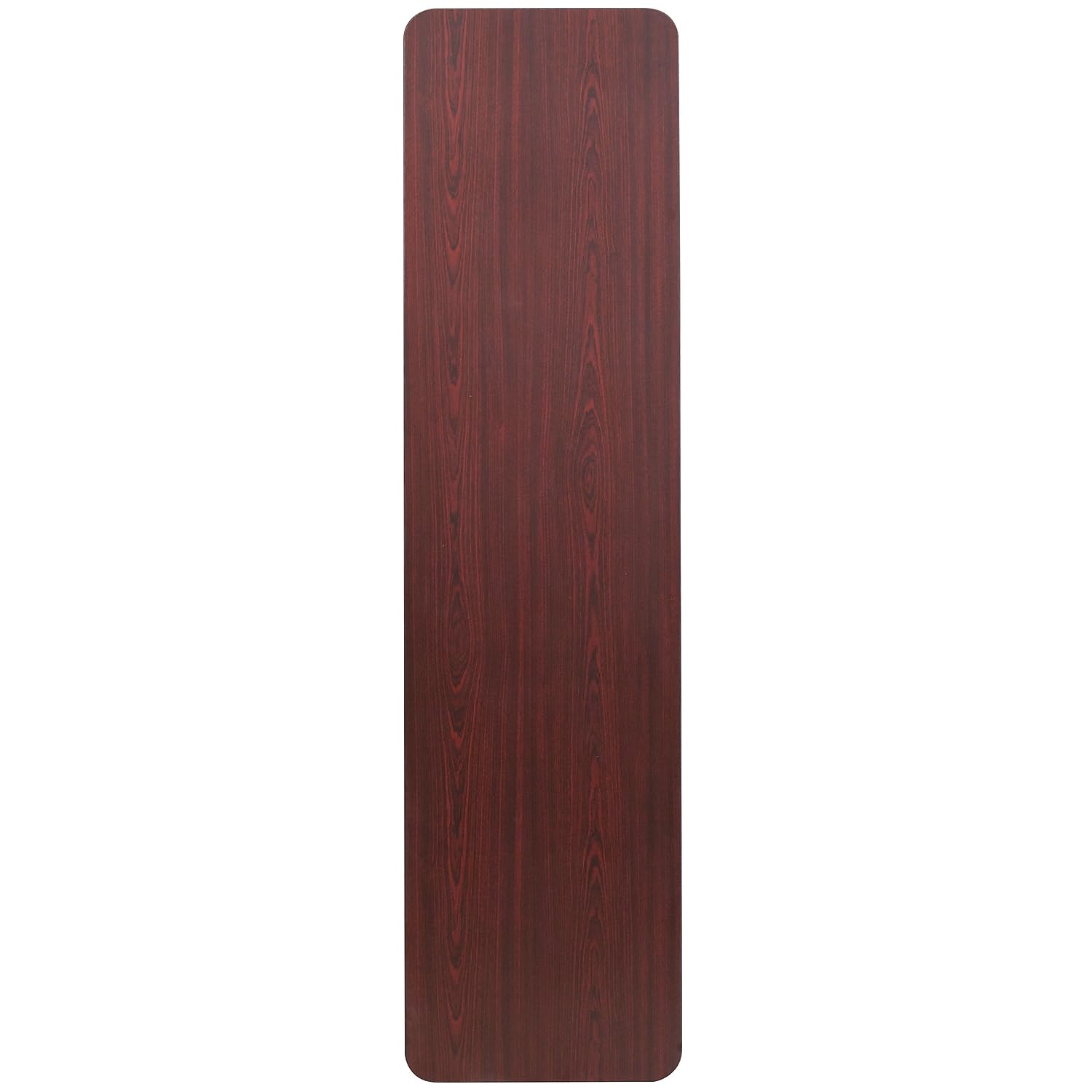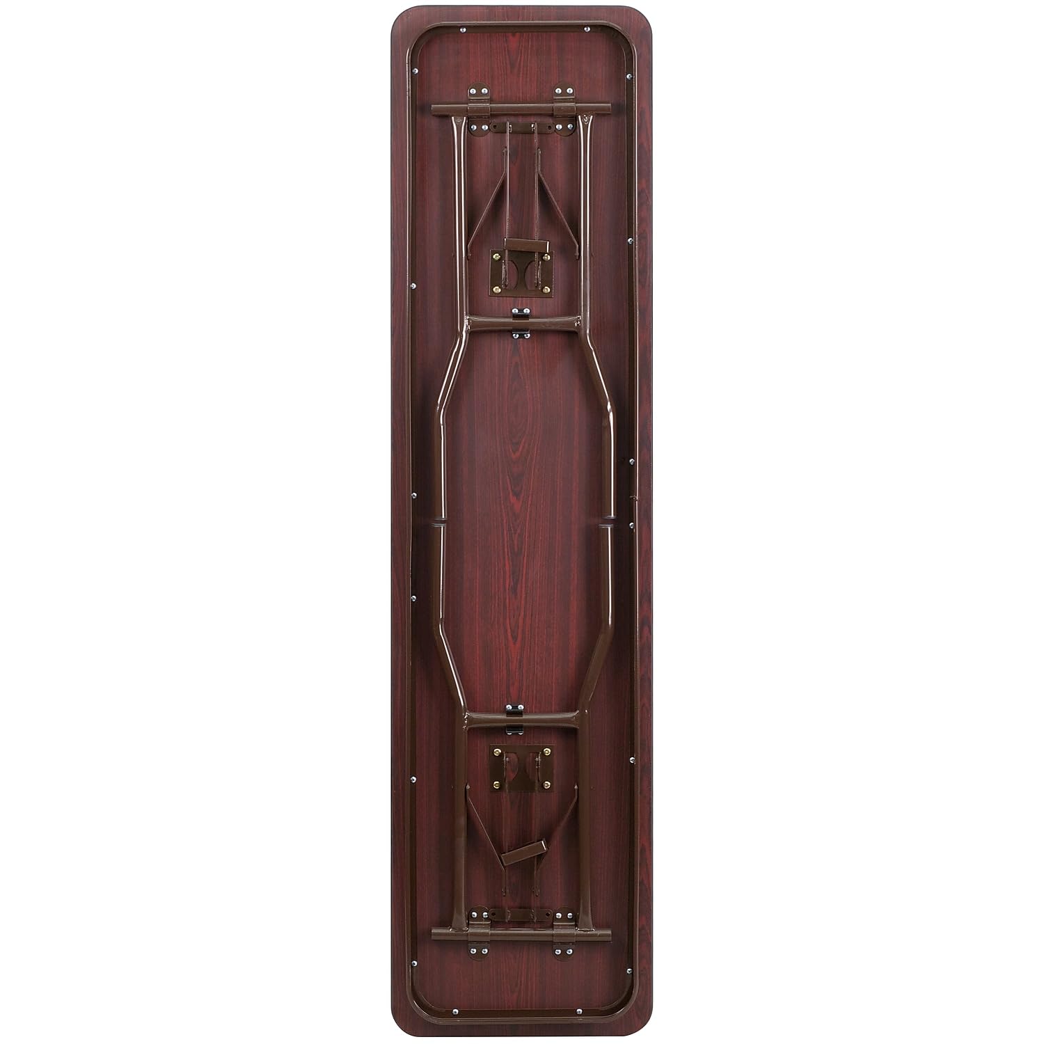 Details: Maximize the space in your training facility or classroom with the Flash Furniture Frankie 6' Mahogany Melamine Laminate Folding Training Table. This versatile rectangular folding table provides the much needed additional space for your new designated training room, classroom, or office, comfortably seating up to 3 adults on one side of the table while allowing each person at the table a clear view of the board and instructor. Make it the test packet pick up spot for your students, host a sip and paint party with friends and family, set up your products at convention centers, or use it to hand out travel brochures or information pamphlets for trainees. Constructed with a 0.75" thick melamine laminate top with a mahogany finish and brown T-mold edge band, this multipurpose training table adds elegant style to your training events and can support up to 308 pounds of static weight. Cleanup is a breeze - simply wipe down with a damp cloth as needed. The brown powder-coated pedestal legs conveniently fold underneath the table to allow for easy transportation and compact storage in-between uses, and the protective non-marring floor caps on the bottom of the legs prevent your flooring surfaces from damages. This rectangular event table measures 18"W x 72"D x 30"H for the perfect size to accommodate all your information papers, supplies, food and drinks, and more.