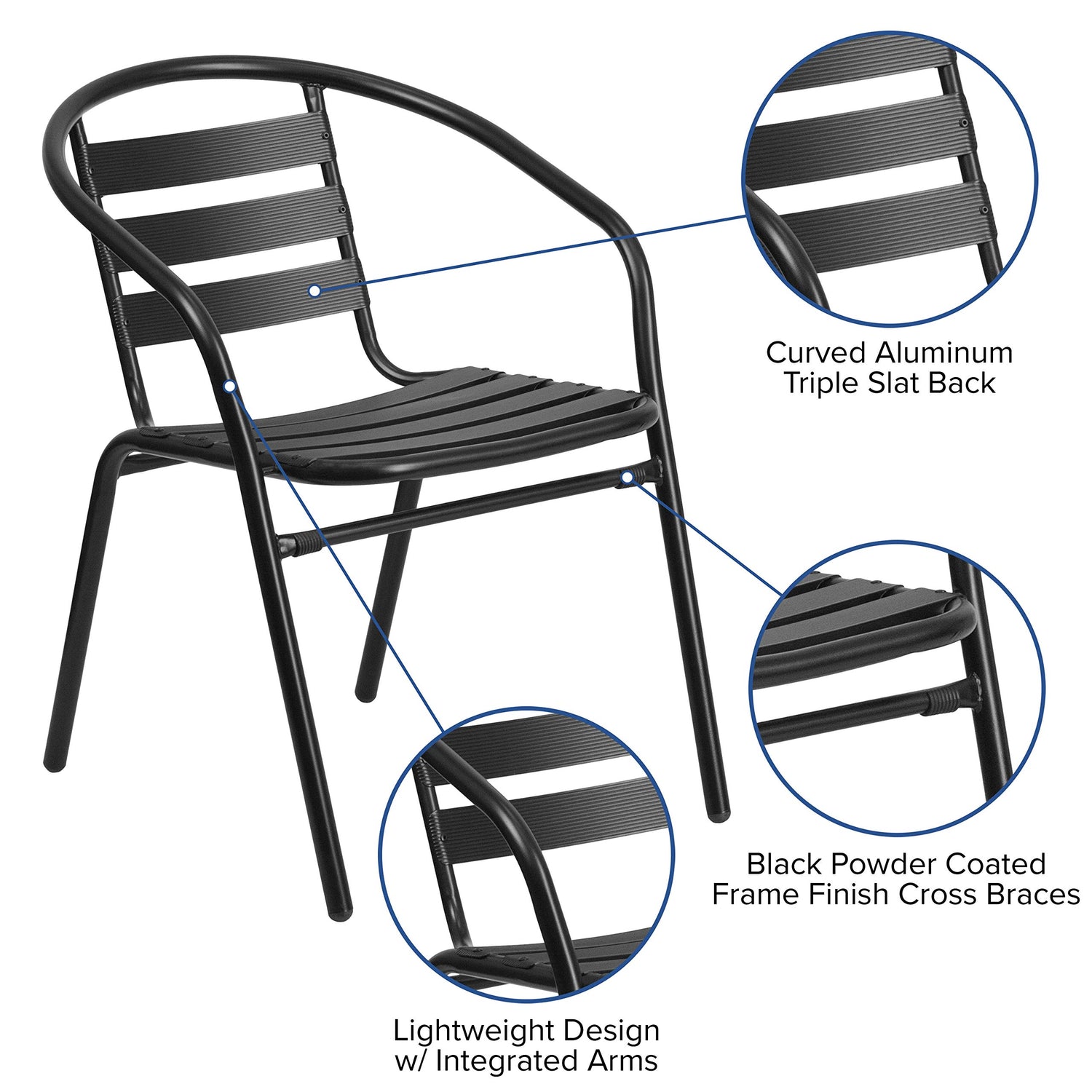 - SLAT BACK PATIO CHAIRS: Overall design is enhanced by the aluminum slat back chairs featuring gently sloped arms that are comfortably designed to help relieve the pressure from your upper body