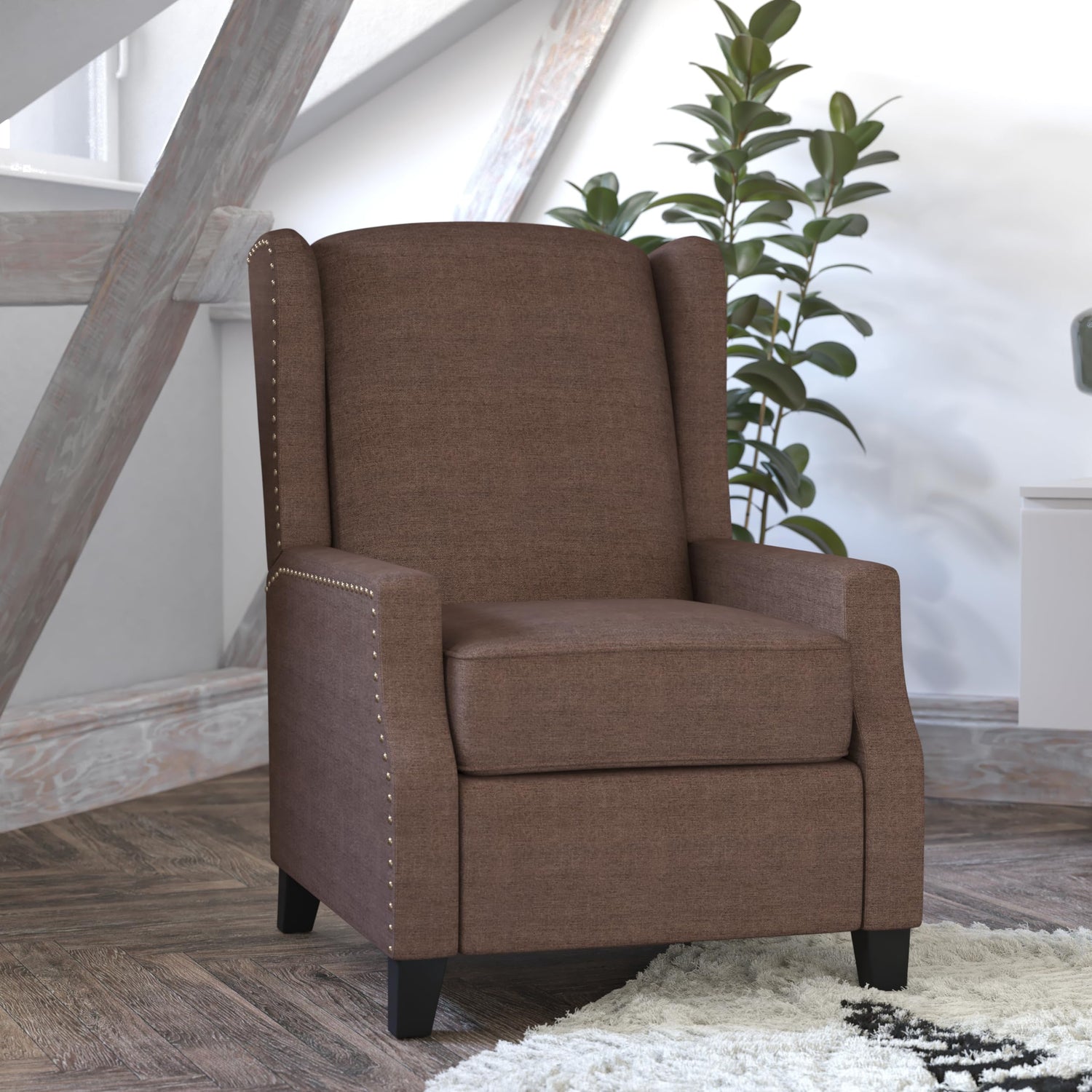 Details: Old school tradition meets modern sophistication in this newly designed slim silhouette push back recliner. Featuring brown polyester fabric upholstery, straight arms, and accent nailhead trim, this living room recliner is just right for refreshing your space or furnishing a new home. High legs in a wood grain finish complete the look of this wingback chair and make floor cleaning easier. Beauty may be only skin deep but this reclining chair is more than a pretty face. A solid plywood core and steel frame with metal screw reinforcements hold up to 275 lbs. static weight to ensure a worry-free seating experience while the generously padded pocket spring seat provides comfort. Simply place your hands on the arms and push backwards letting your weight recline the back and raise the footrest. Assembly of your new recliner requires no tools and takes less than 10 minutes with the included illustrated assembly instructions. Spot clean with water and a neutral detergent to maintain the chairs appearance. Fixed plastic floor glides will prevent damage to your hard flooring surfaces if you bump the chair or choose to move it.