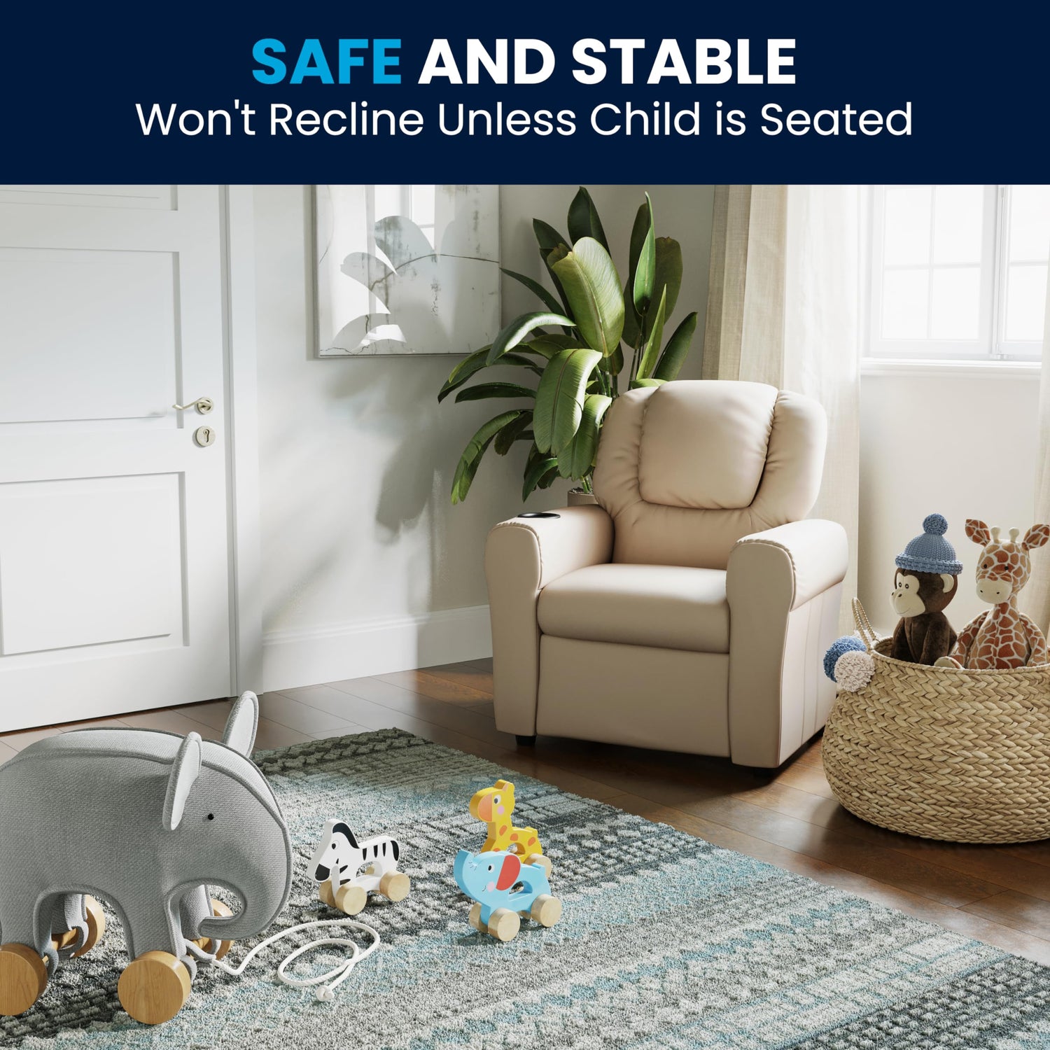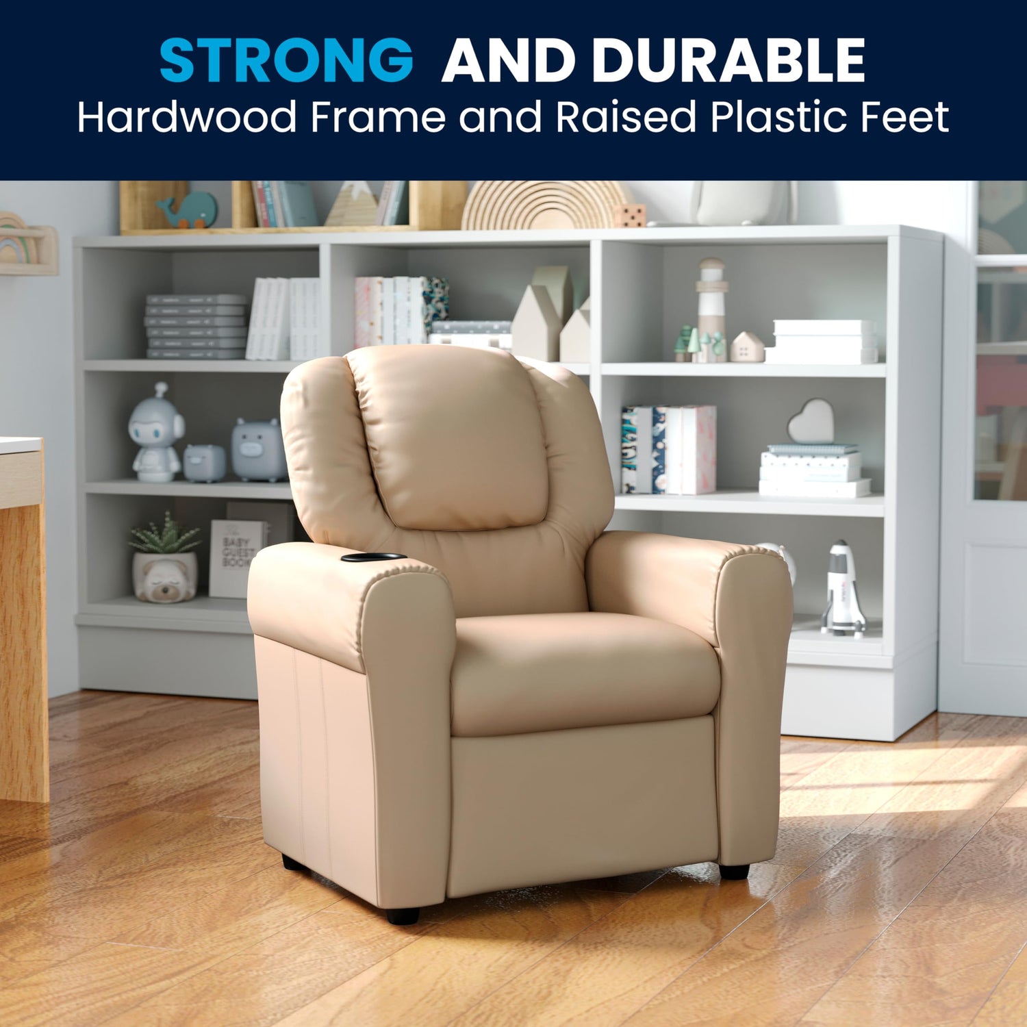 Flash Furniture Vana Vinyl Kids Recliner with Cup Holder, Headrest, and Safety Recline, Contemporary Reclining Chair for Kids, Supports up to 90 lbs., Beige