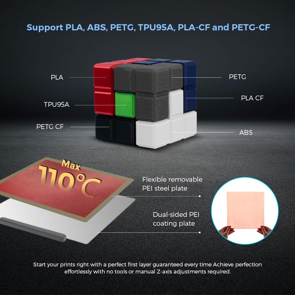 - 【Robust designs for superior quality】Open 3D printer, Suitable for use in open and, well-ventilated environments, Flexible removable PEI steel plate support PLA/PETG/TPU (0.4mm nozzle) and PLA-CF/PETG-CF (0.6mm nozzle).