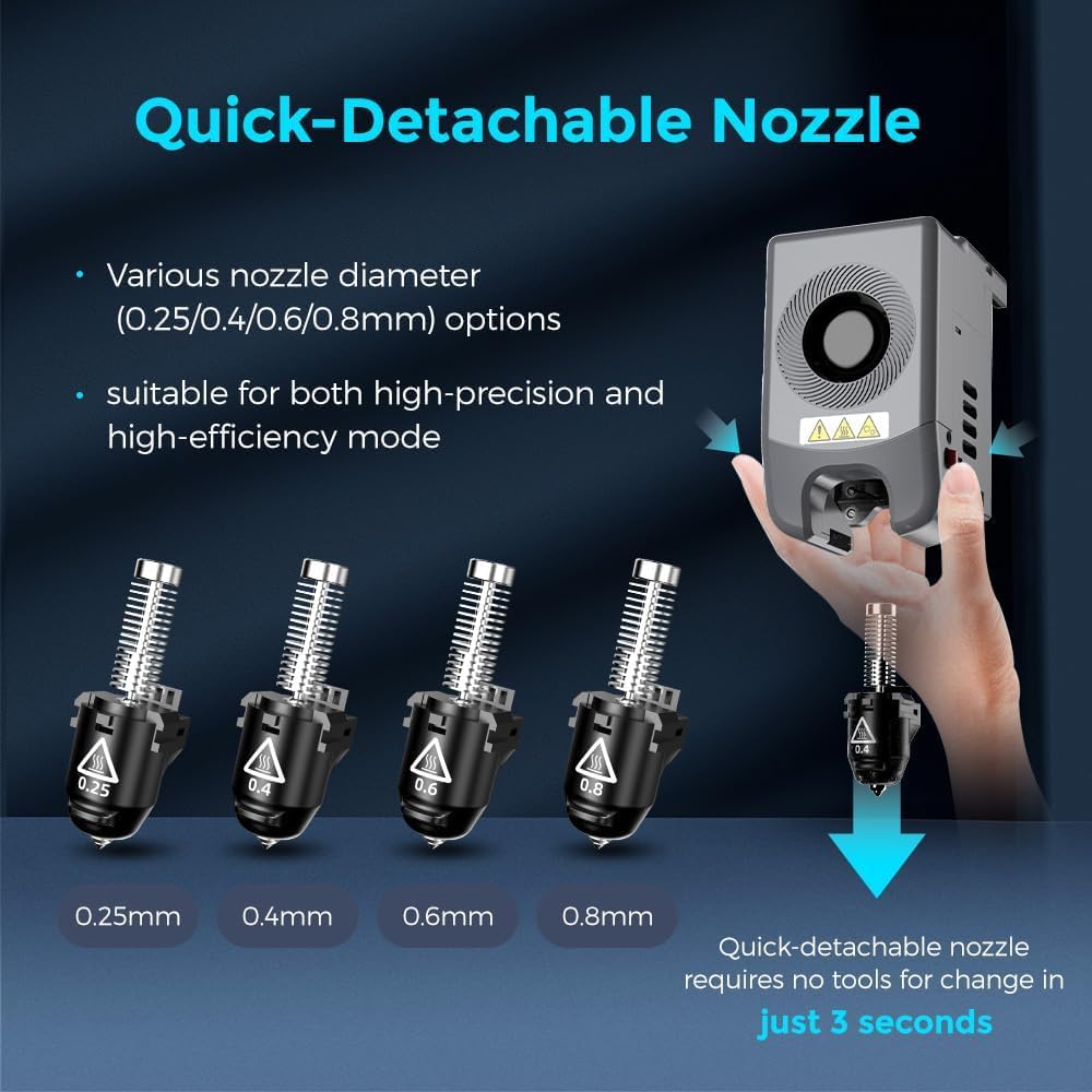 - ➡️Open 3D printer, Suitable for use in open and, well-ventilated environments, Flexible removable PEI steel plate support PLA/PETG/TPU (0.4mm nozzle) and PLA-CF/PETG-CF (0.6mm nozzle). Choose from various nozzle diameter options (0.25/0.4/0.6/0.8 mm) for high precision or high efficiency modes. Whether you're a novice or an expert, maintenance is a breeze with this smart and efficient choice for all your creative projects.