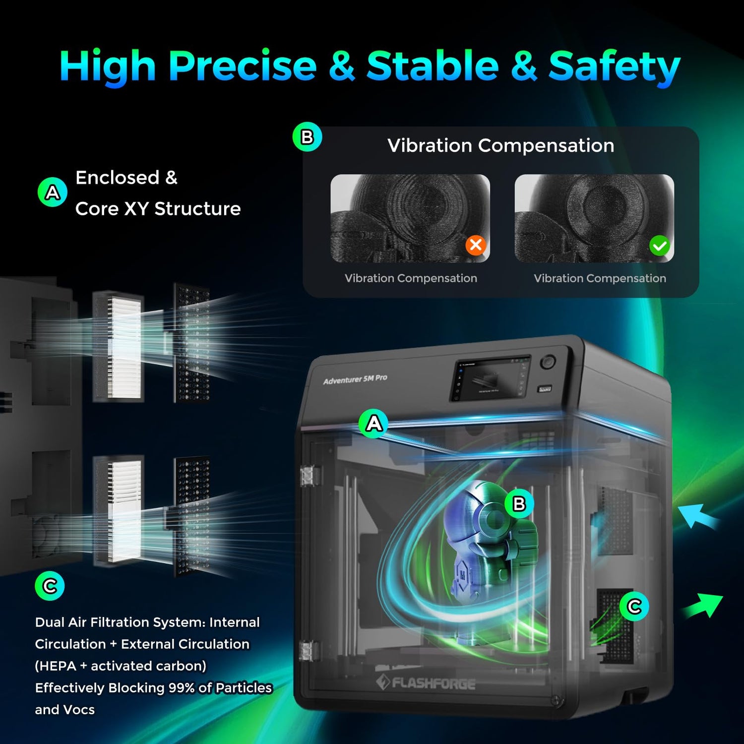 - Enhanced 12X Faster Printing: 50db Low Printing noise, Adventurer 5M Pro 3D Printer is designed for efficiency, the core XY structure ensure stable at max.speed of 600mm/s and 20000mm/s² Acceleration.Enclosed 3D printer equipped with a dual filtration system of internal and external, effectively blocking 99% of particles and VOCs, protecting respiratory system